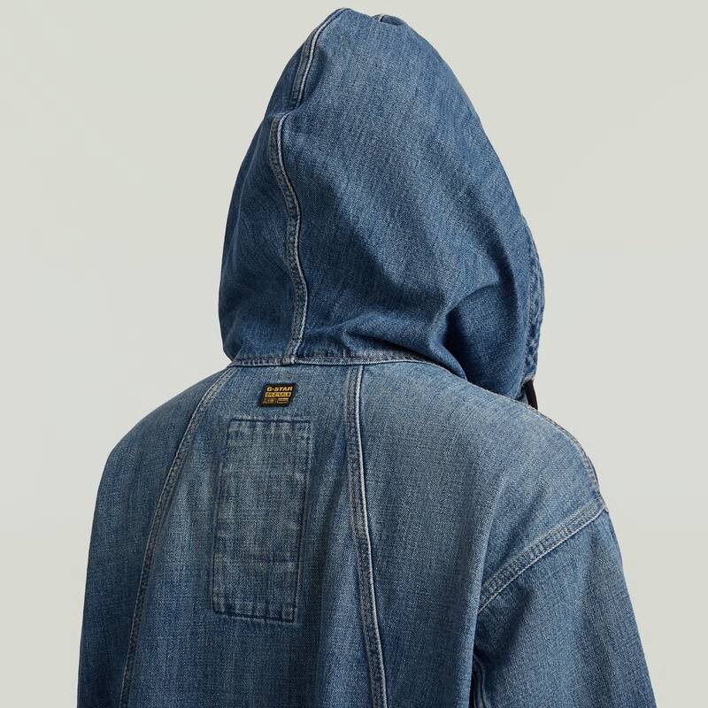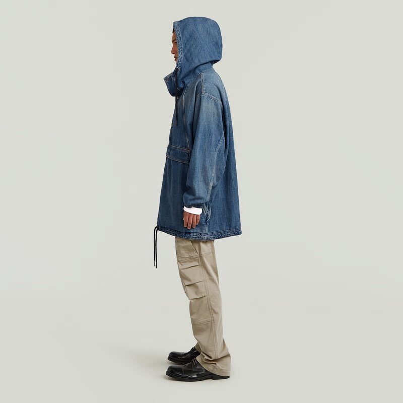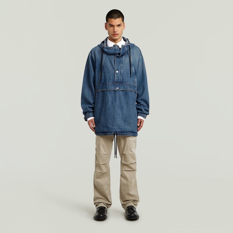 Denim anorak Parachute is cut in an oversized fit. Offering a hood with a raised front and drawcords. This jacket features a front pocket with a snap button closure. Side seam pockets are set underneath. The sleeves can be reduced in width, through the snap buttons applied. Use the drawcord in the hem to add volume.