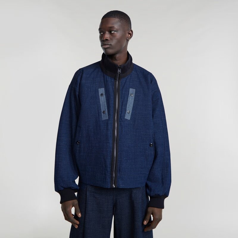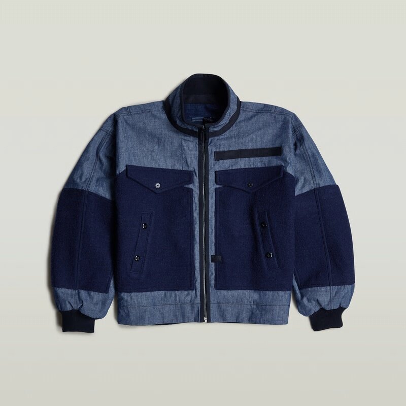 The Unisex Maxi Bomber is designed in the G-Star RAW Research lab. This reversible piece offers two unique styles. One side has a lightweight chambray base with woolblend pockets and elbow patches. The woven tapes add detail. The other side offers a clean look with welt pockets at the chest and waist.