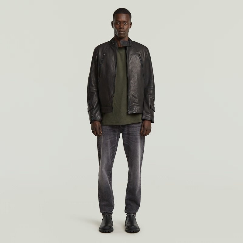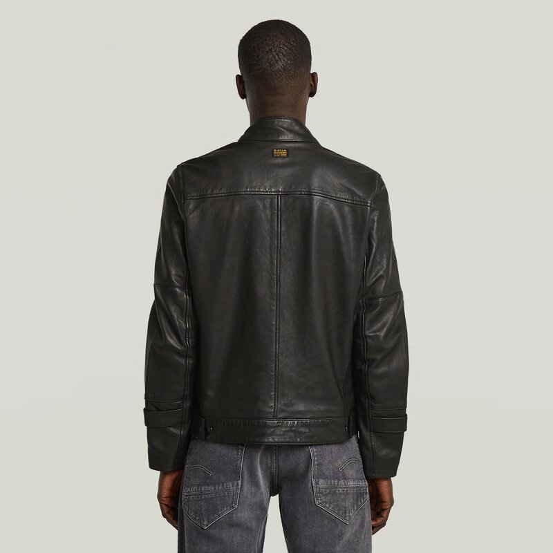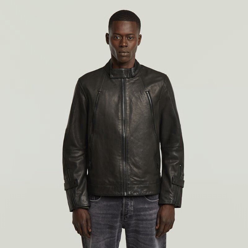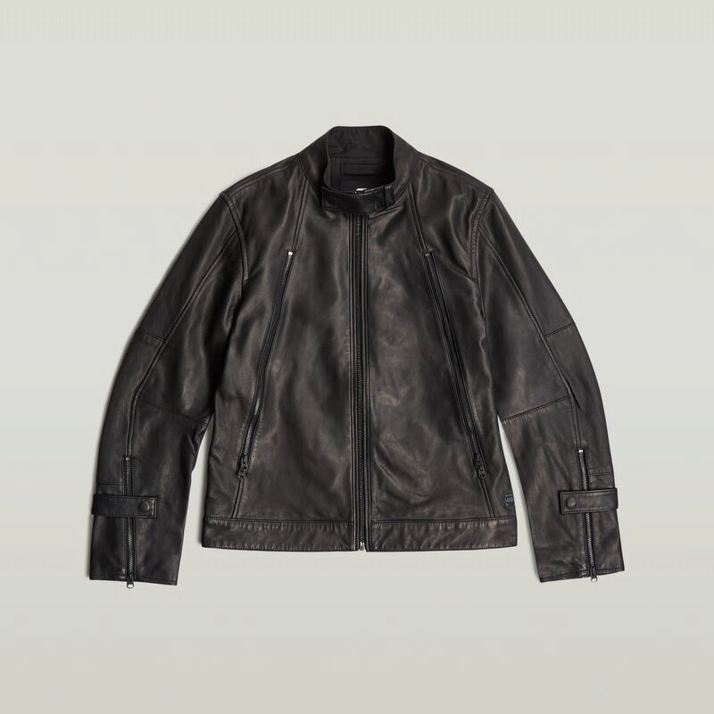 The Biker Leather Jacket features a slim fit with a stand-up collar and long sleeves.