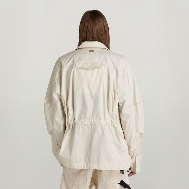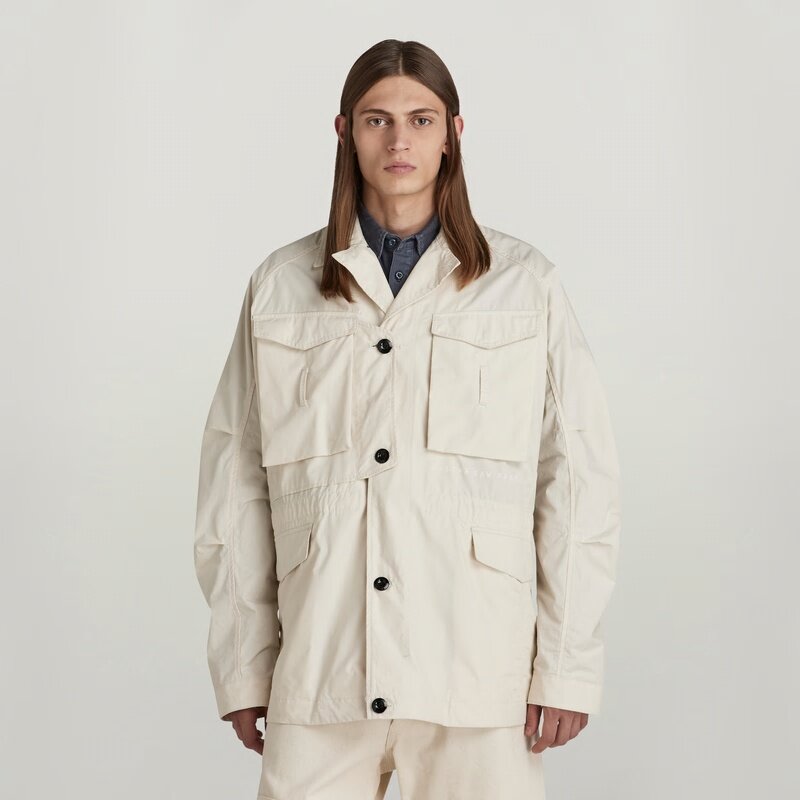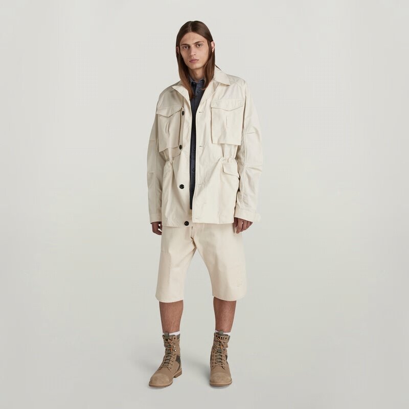 Jacket Field is designed in a roomy fit with a button closed front. Flap pockets are placed at the chest and waist, offering a hidden snap button closure. Underneath one of the chest pockets, an angled pocket is added. The design of this field jacket shows an additional flap pocket at the upper back. Adjustability is created at the cuffs (additional button) and waist (drawcord at the inside).