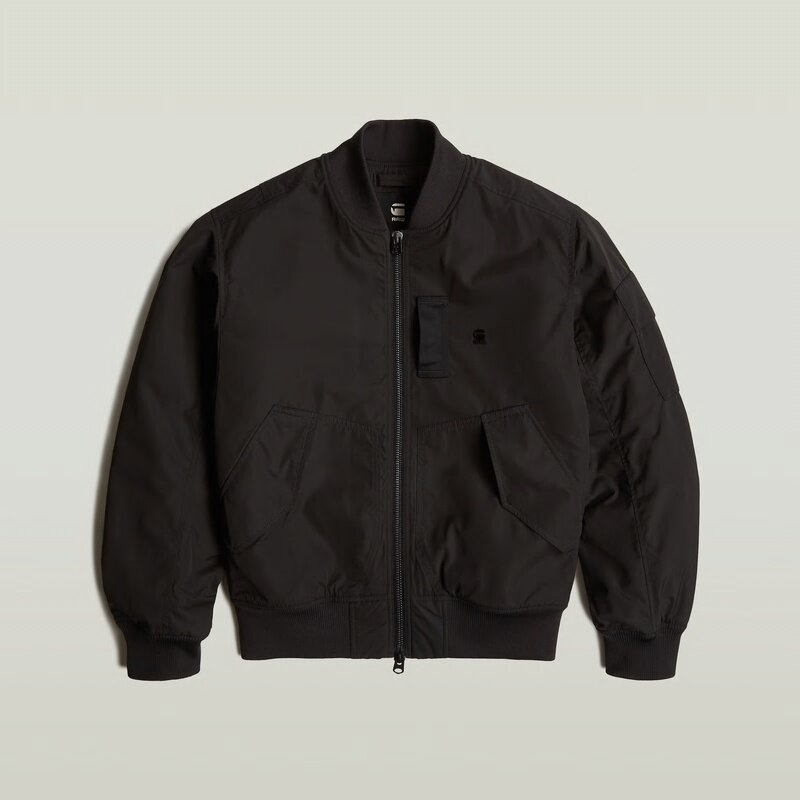Padded Bomber G-A1 offers a 2-way zip closure. Welt pockets with a snap button are created at the waist. Flap pockets are added to the waist and another pocket is set at the upper sleeve. The woven tape at the chest adds detail.