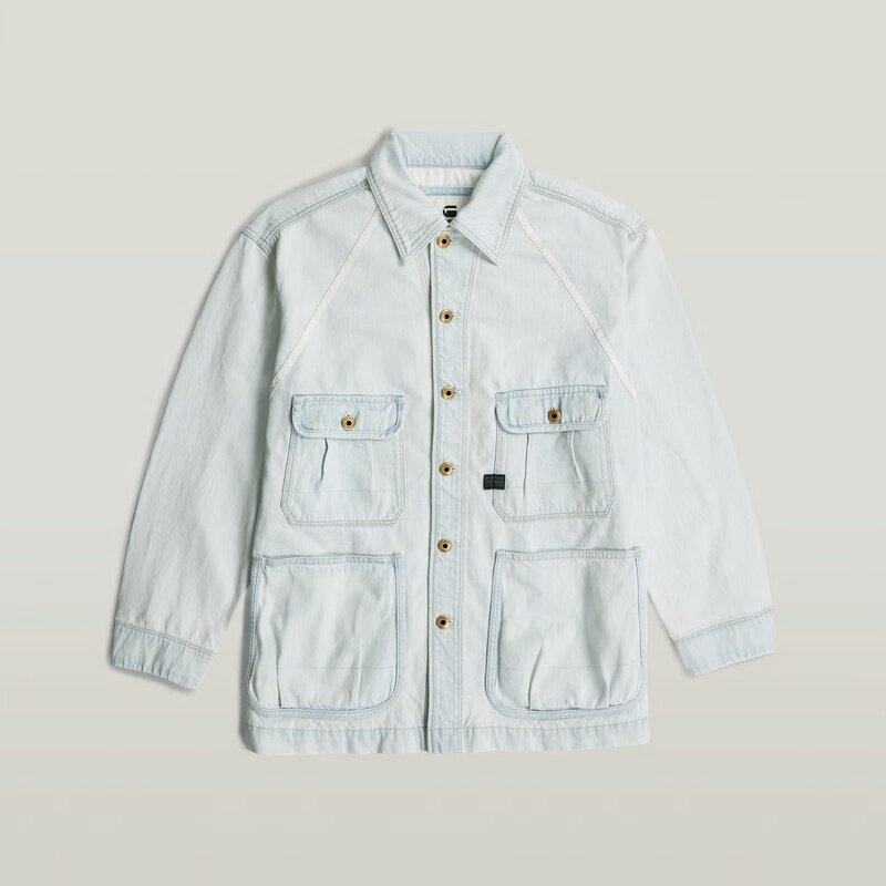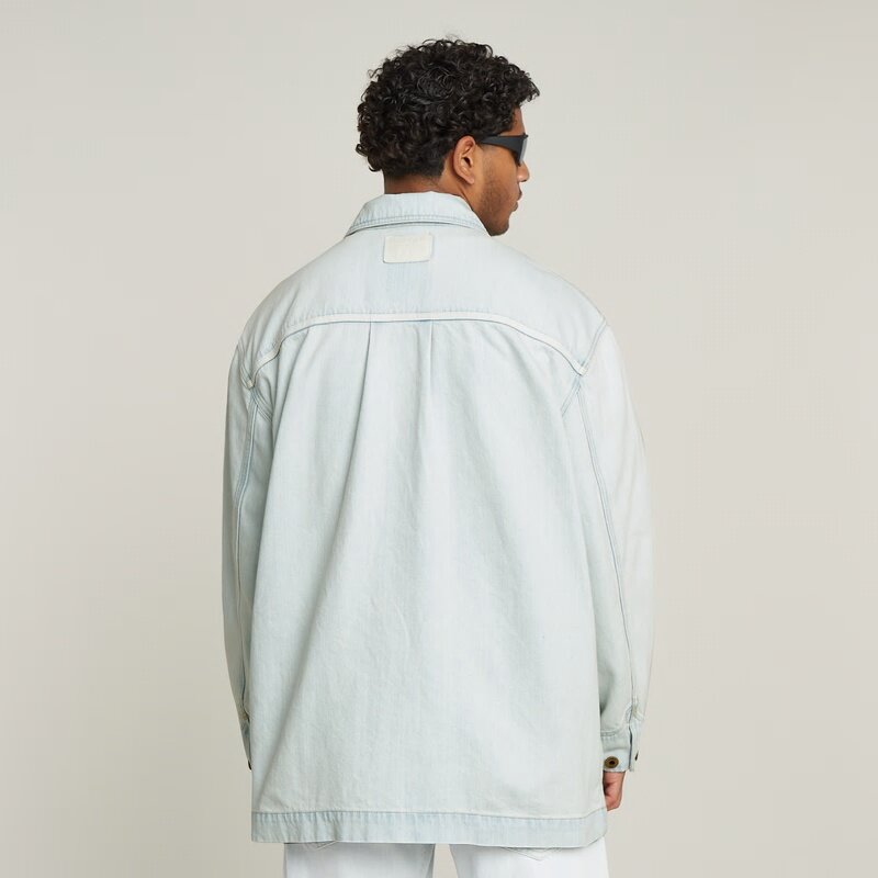 Oversized jacket Chore is a denim jacket with a shank button closure. Offering pockets at the chest and waist, a volume pleat at the back and woven tape details.