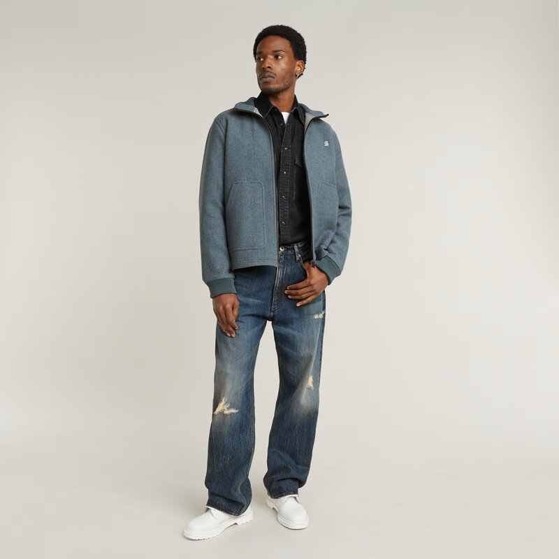 The Utility Wool jacket offers a straight fit with a zipper closure. The raised collar and the cuffs are created out of a comfortable ribbing. The back is slightly extended. The sleeves are lined with a smooth woven fabric to allow for an easy access. Front pockets complete it.