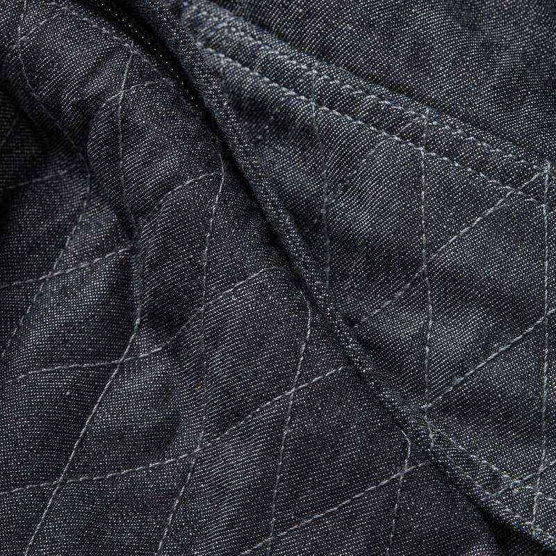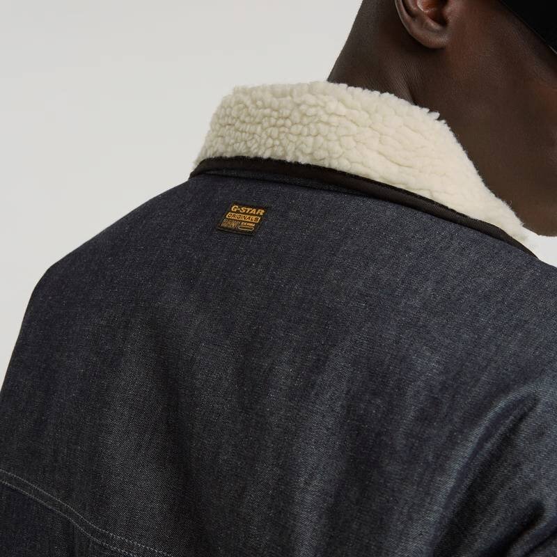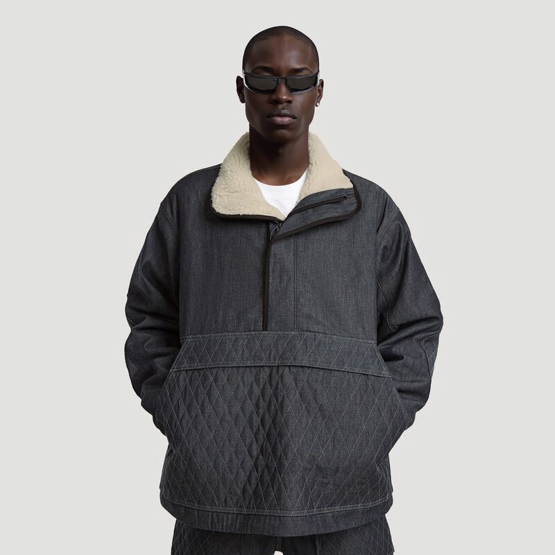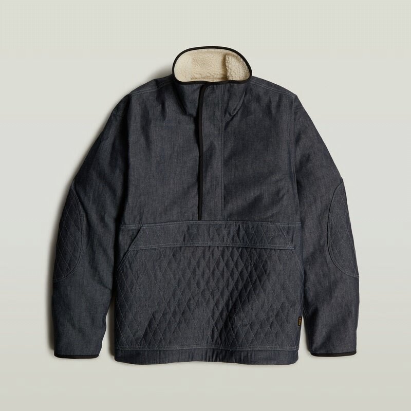 The Padded Shanorak shows a raised collar with a soft touch teddy on the inside. A short zipper is placed concealed at the front. This denim anorak shows a zipper pocket at the front, offering a kangaroo pocket underneath. Volume can be created by pulling the drawcord at the bottom edge.