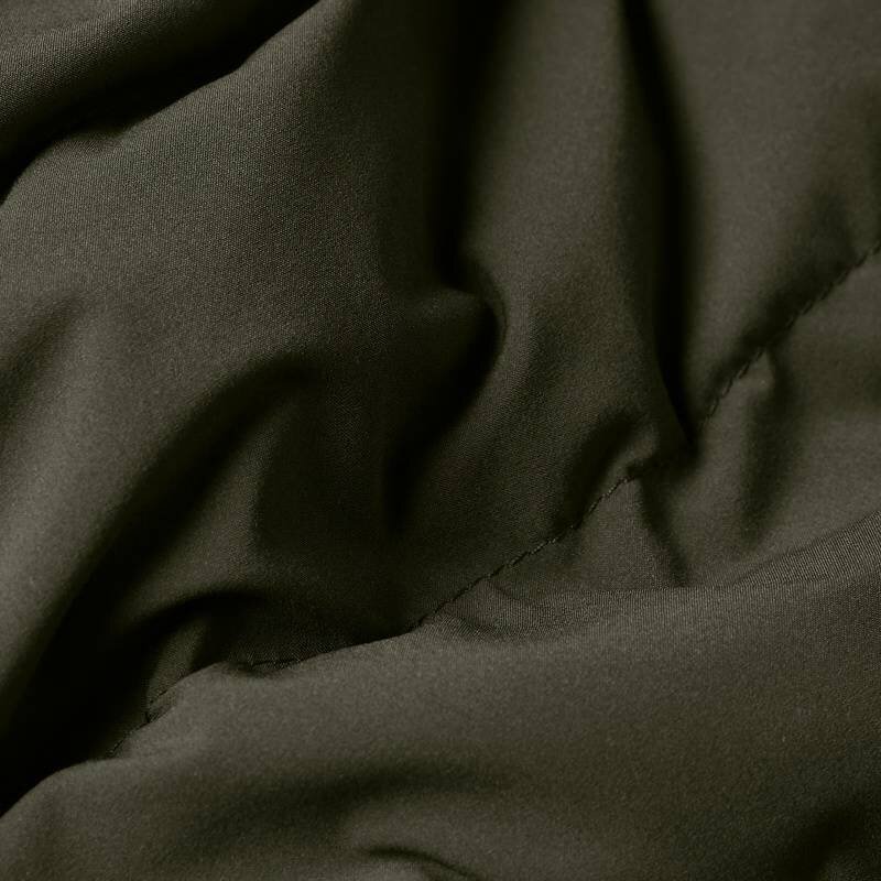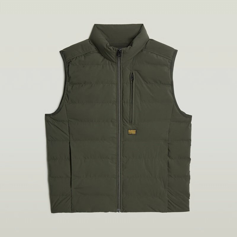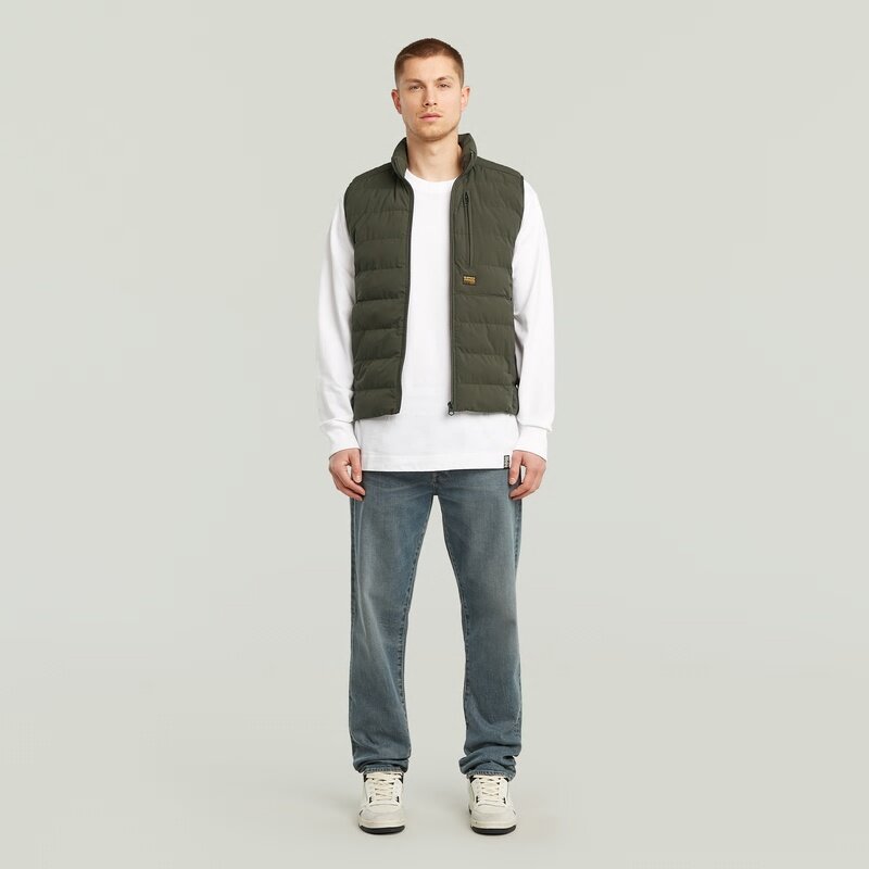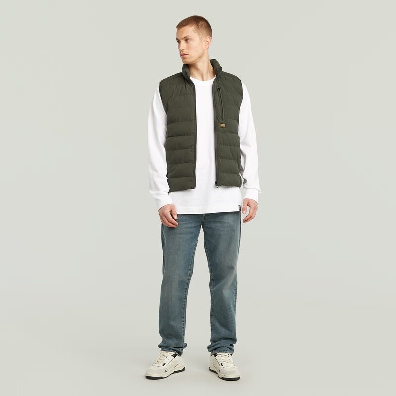 Liner vest Foundation is padded and stitched through horizontally. Pockets are created at the chest and sides. For ease, an additional pocket and hanger loop are added inside.