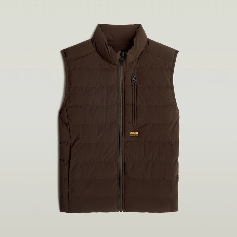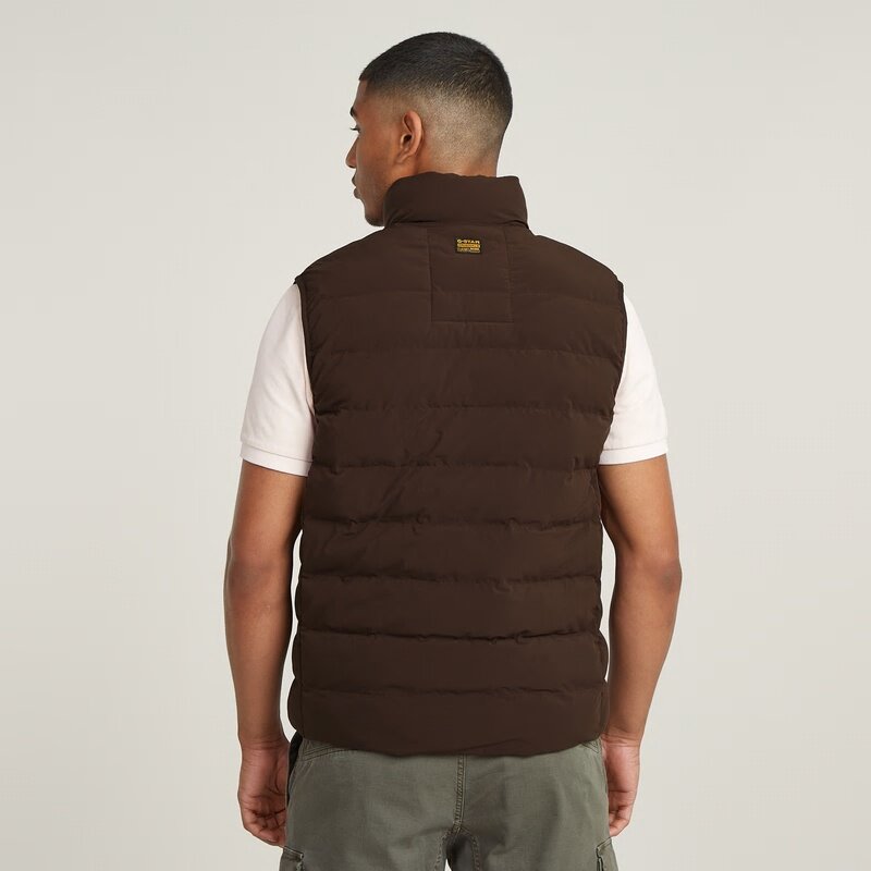 Liner vest Foundation is padded and stitched through horizontally. Pockets are created at the chest and sides. For ease, an additional pocket and hanger loop are added inside.