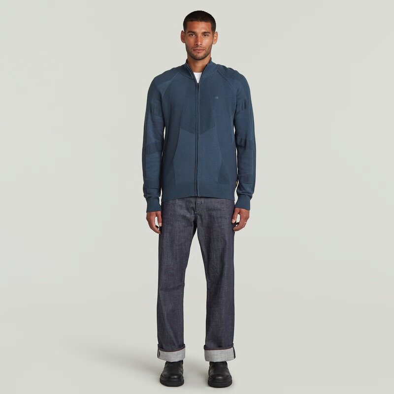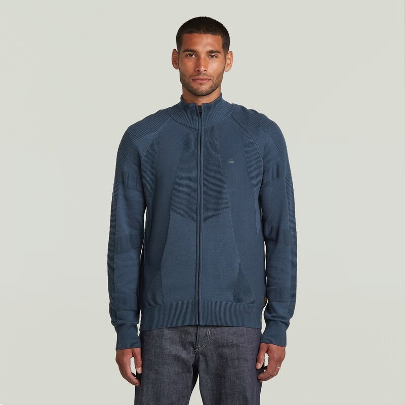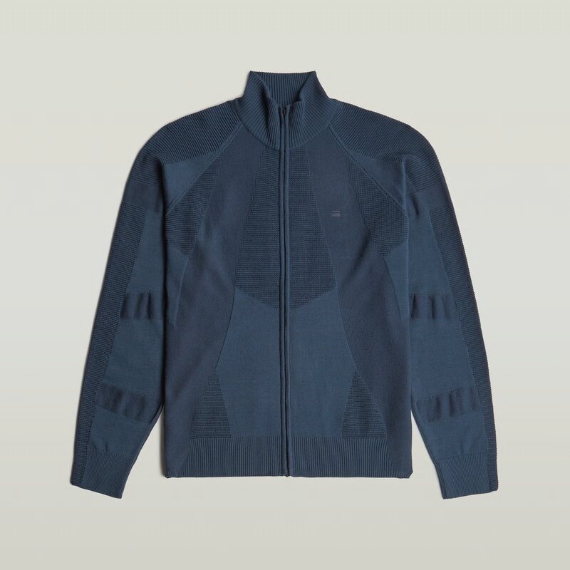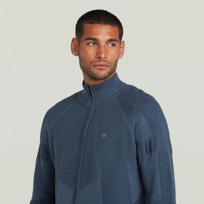The 3D Biker Full Zip Knit features a unique design with a zip closure and stand-up collar.