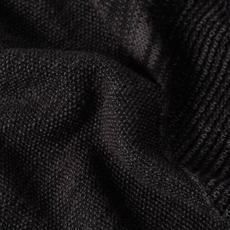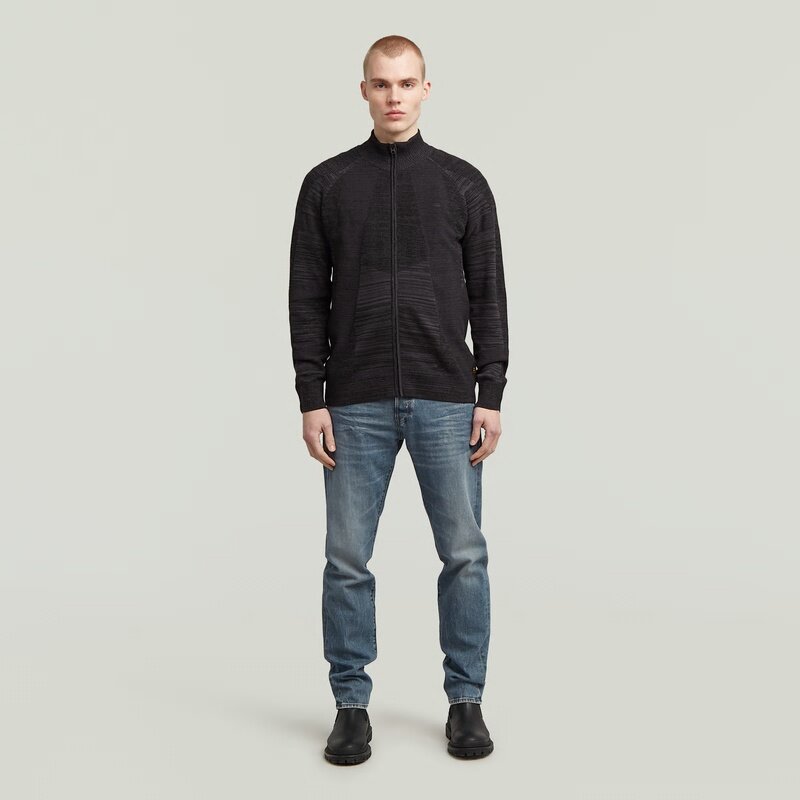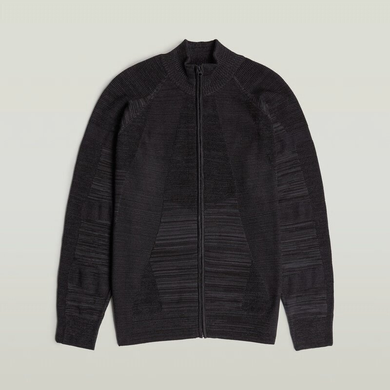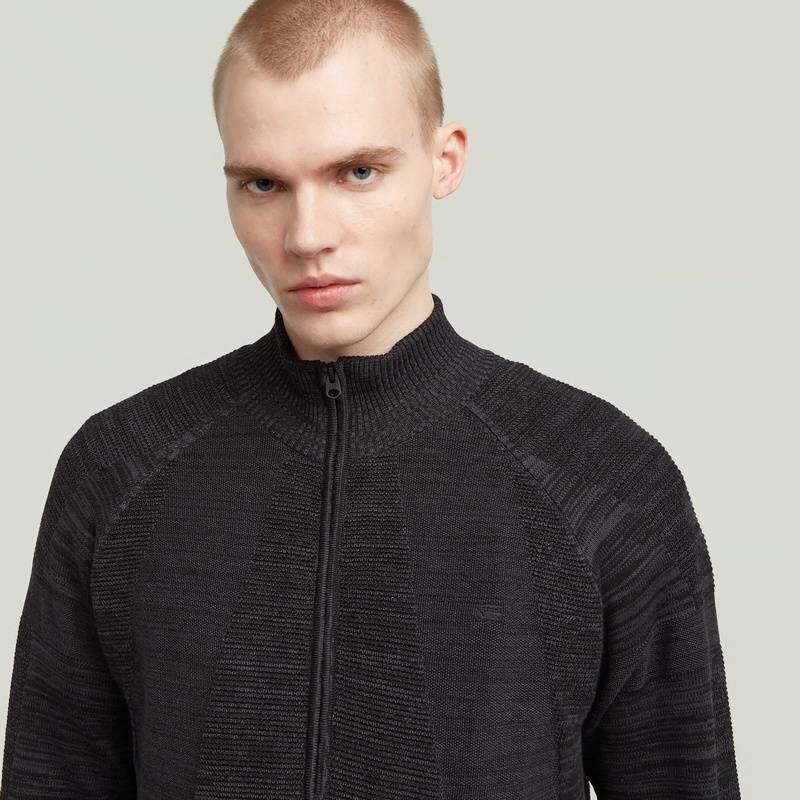 The 3D Biker Full Zip Knit features a unique design with a zip closure and stand-up collar.
