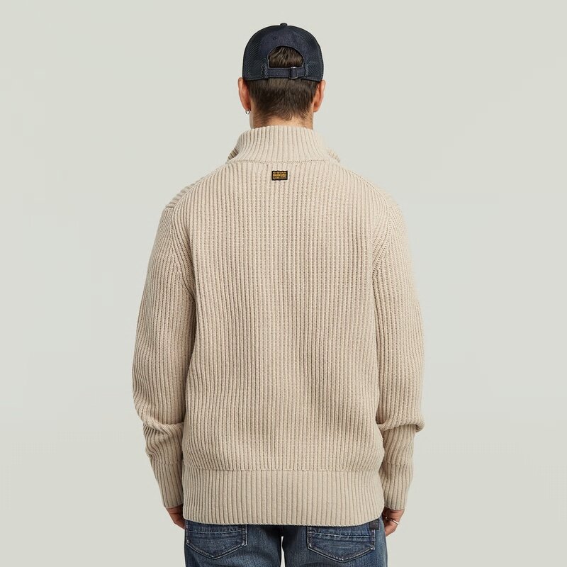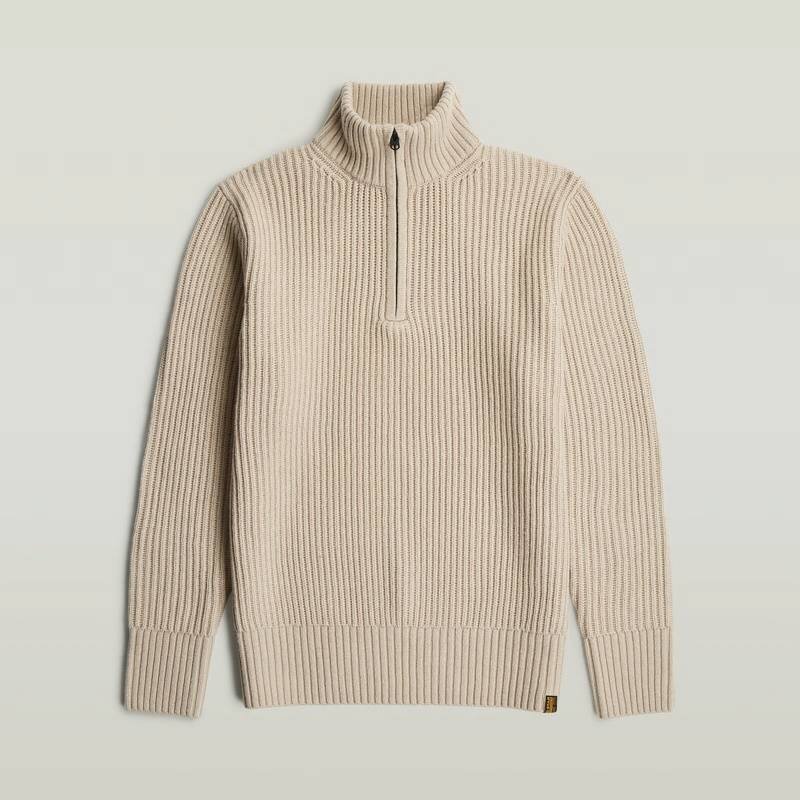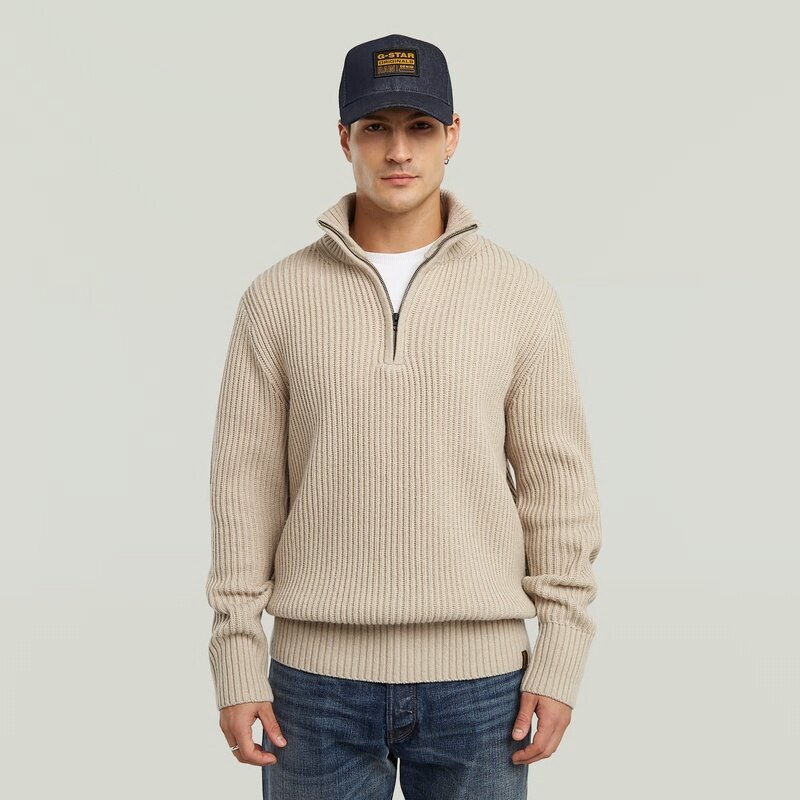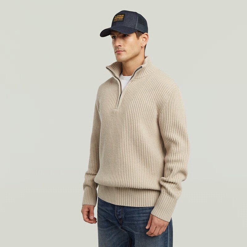 The Essential Half Zip Knit features a regular fit with a stand-up collar and zip closure, offering a comfortable and stylish look.