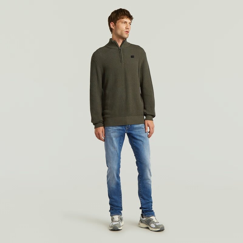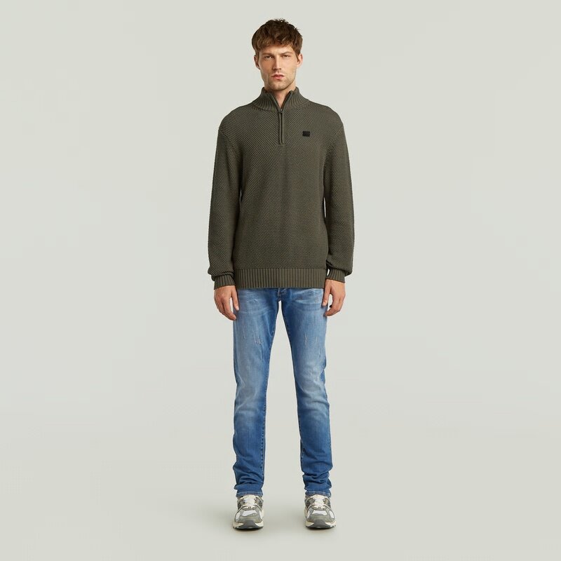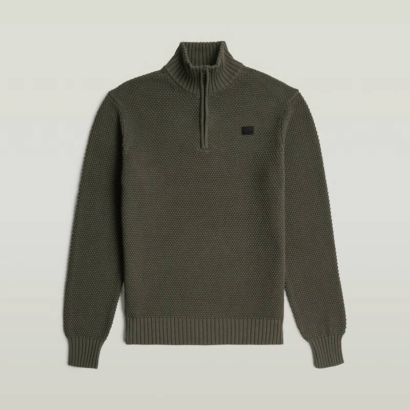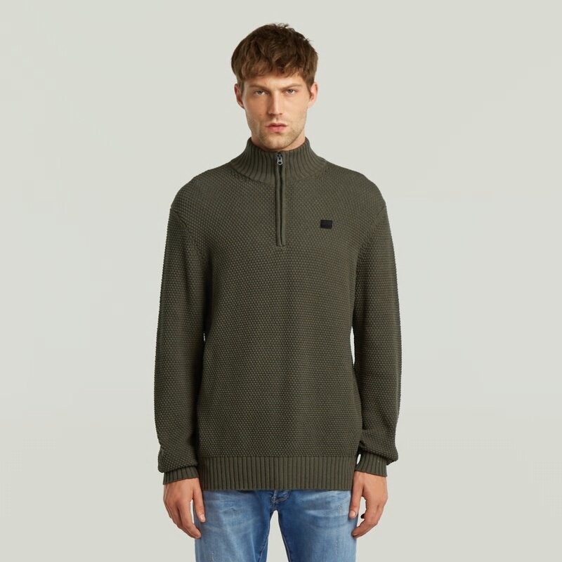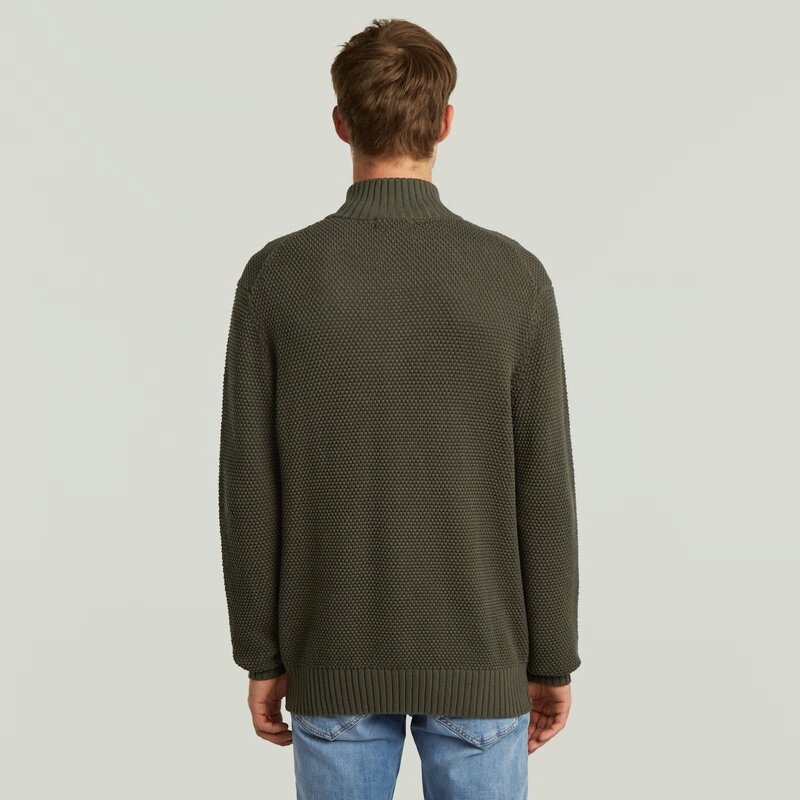 The Honey Comb Structure Skipper Knit features a textured knit design with a stand-up collar and a zip closure for added versatility.