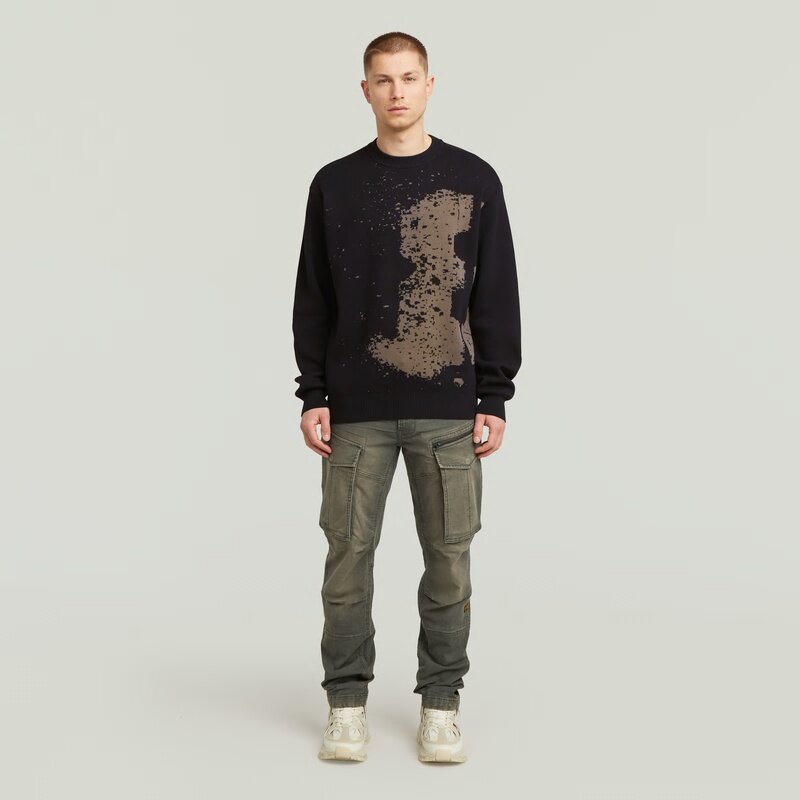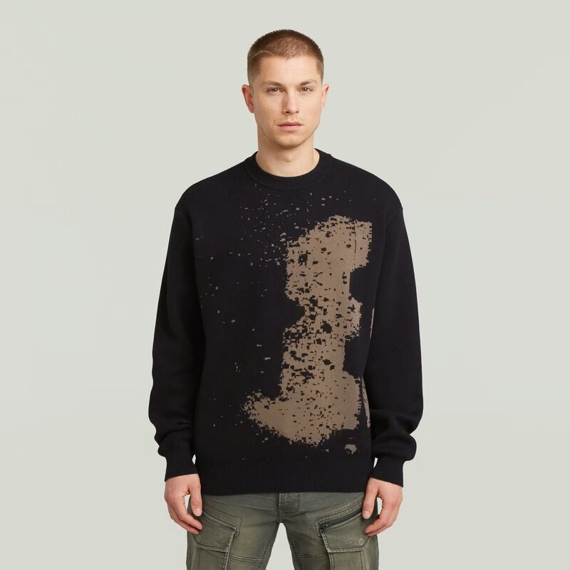 The Sprayed 89 Pullover features a relaxed fit with a unique graphic design. Its ribbed knit adds texture and style.