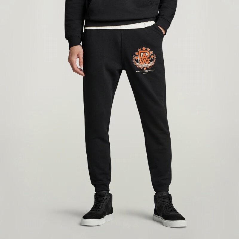 Sweat pants Royal Varsity offer a slim fitted silhouette with ribbed cuffs and a ribbed waist. A drawcord is added to finetune the width. At the front leg of these joggers, a graphic print is set. Inset pockets are combined with a single patch pocket at the backside.