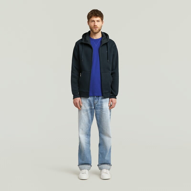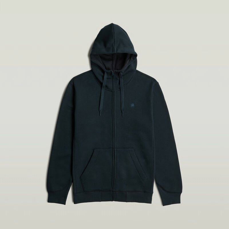 The Premium Core zip sweater features a hood with drawstrings and ribbed cuffs.