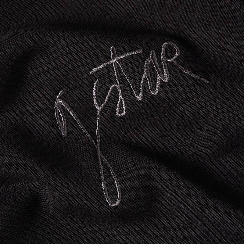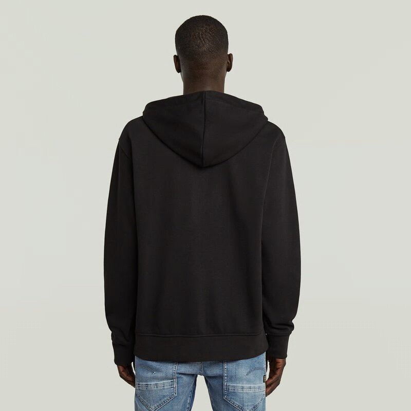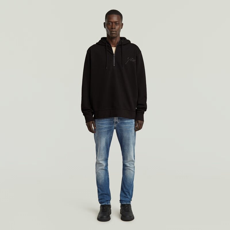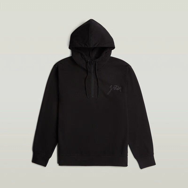 The Script Half Zip Hoodie features a relaxed fit with a stand-up collar and hood.