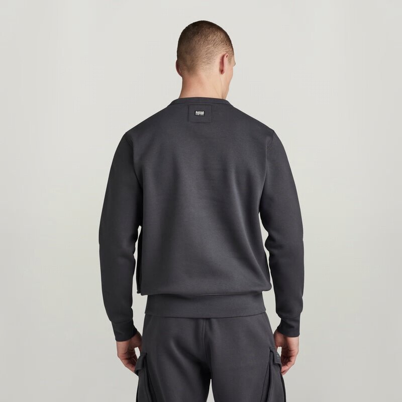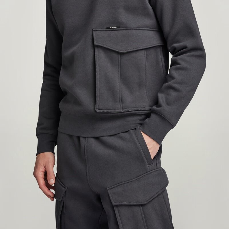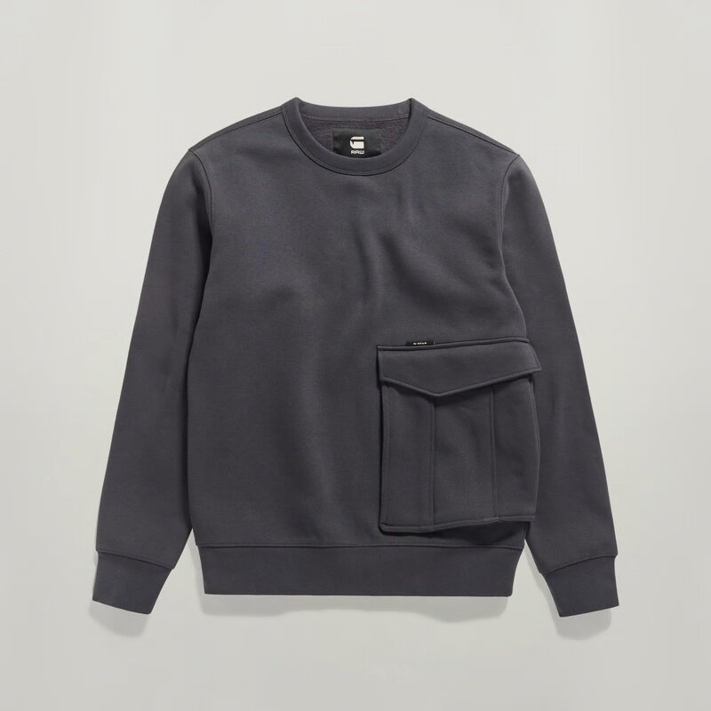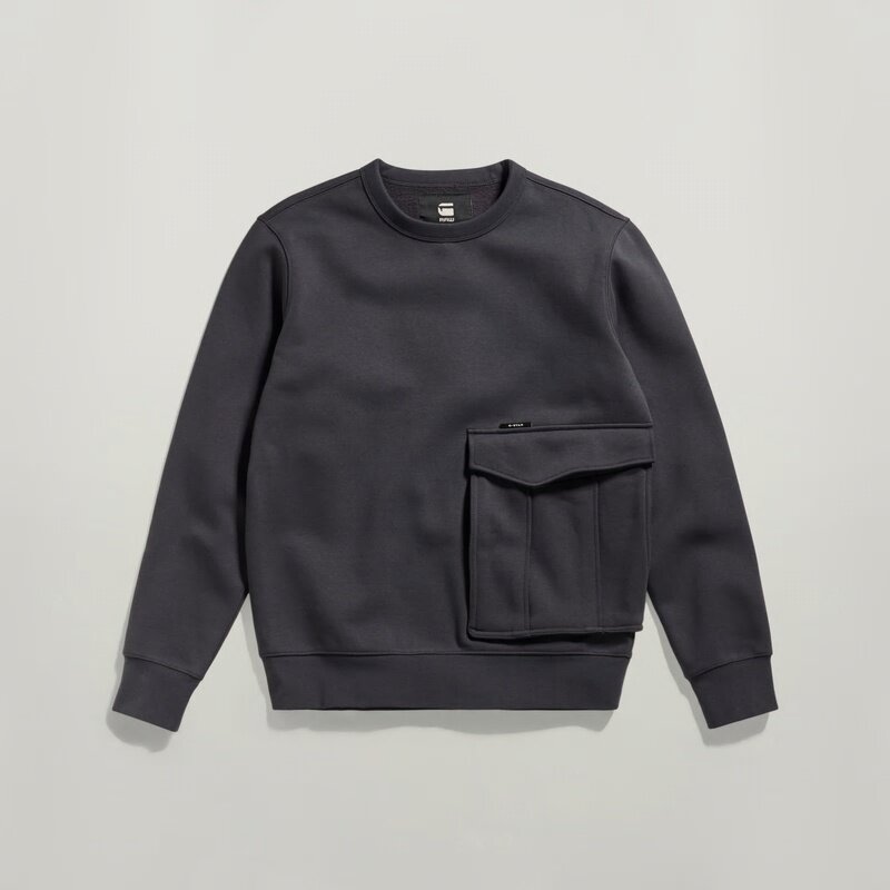 Sweater Cargo features a straight fit with a rounded neckline. A broad cargo pocket with a concealed snap button is added to the side. The neckline, cuffs and waist are created out of a ribbed knit.