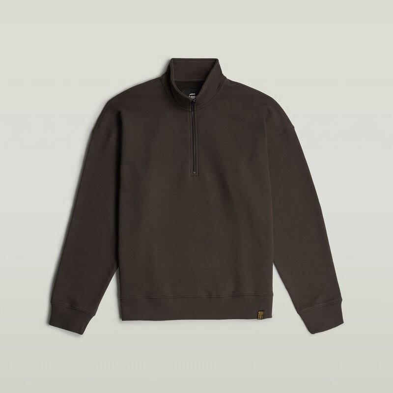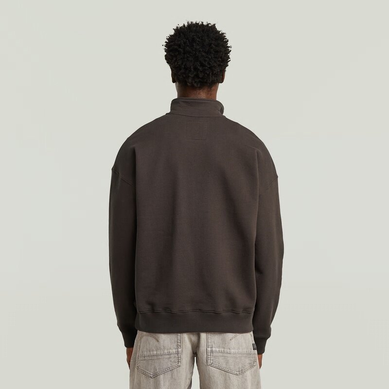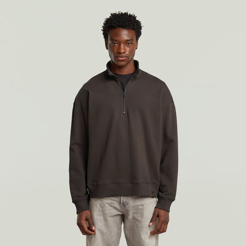 The Essential Loose Half Zip Sweater features a zip closure and a stand-up collar, offering a relaxed and versatile style.
