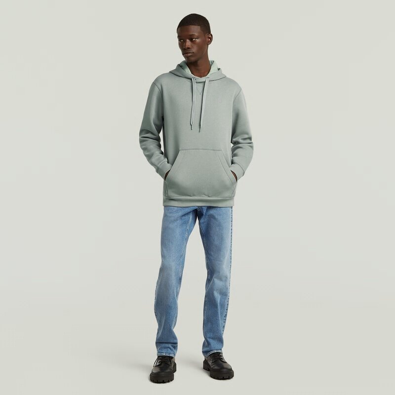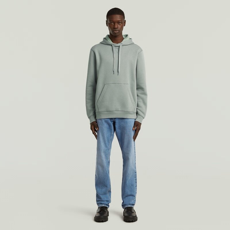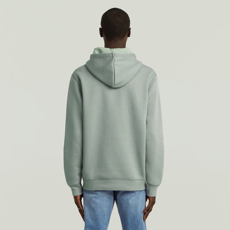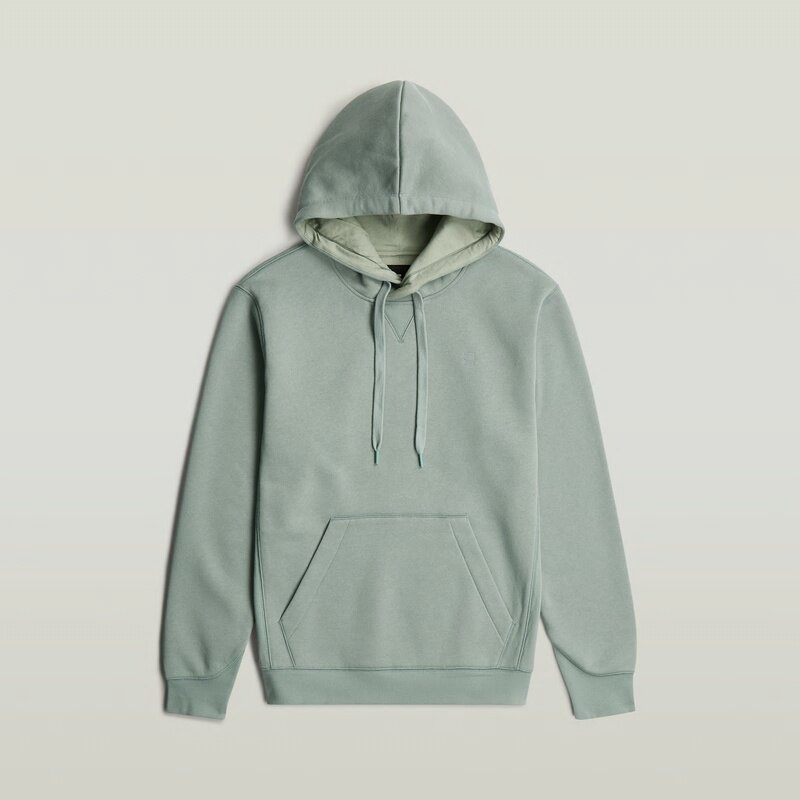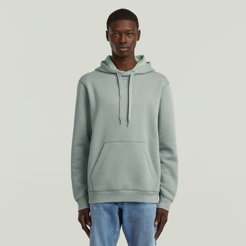 The Premium Core hooded sweater features a kangaroo pocket and a hood with a drawstring. The front shows a cross over construction and a ribbed inset piece. Long sleeves have a curved finish, showing a ribbed cuff underneath. The chest signs this hoody with a subtle G-Star RAW logo.