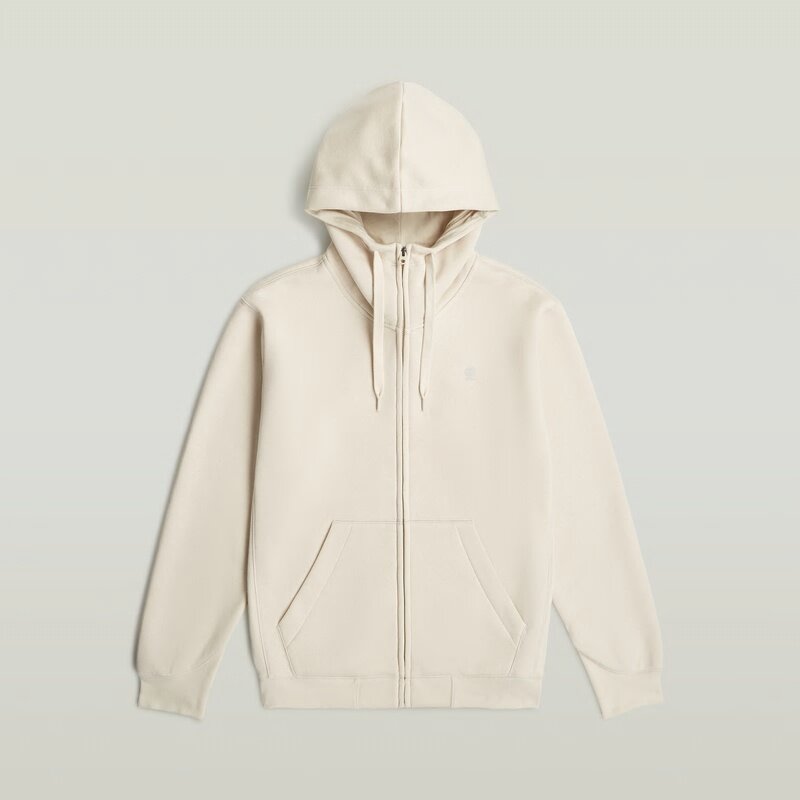 The Premium Core hooded zip sweater features a hood with drawstrings and ribbed cuffs.