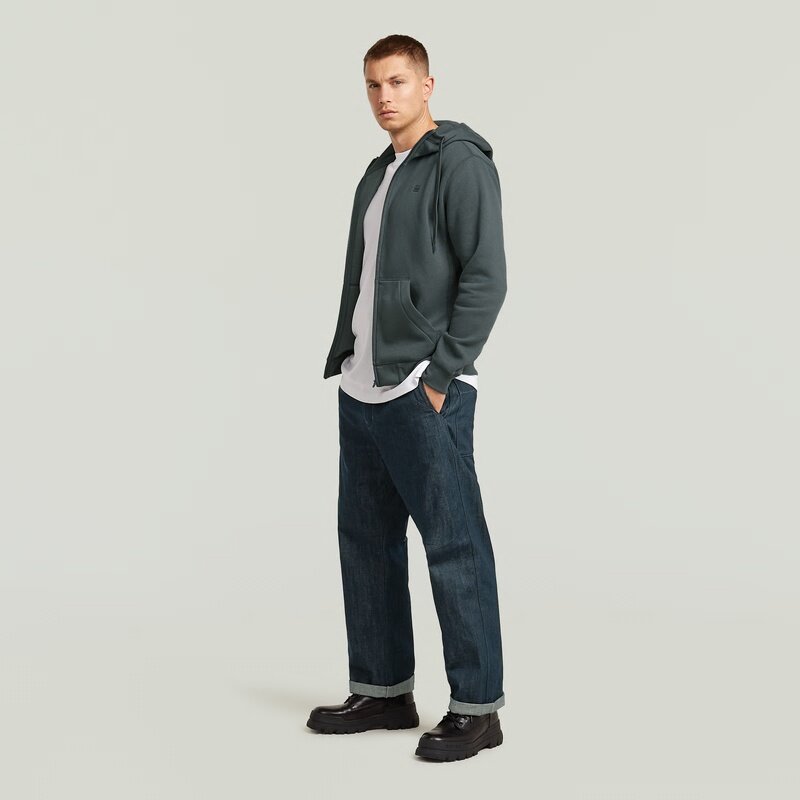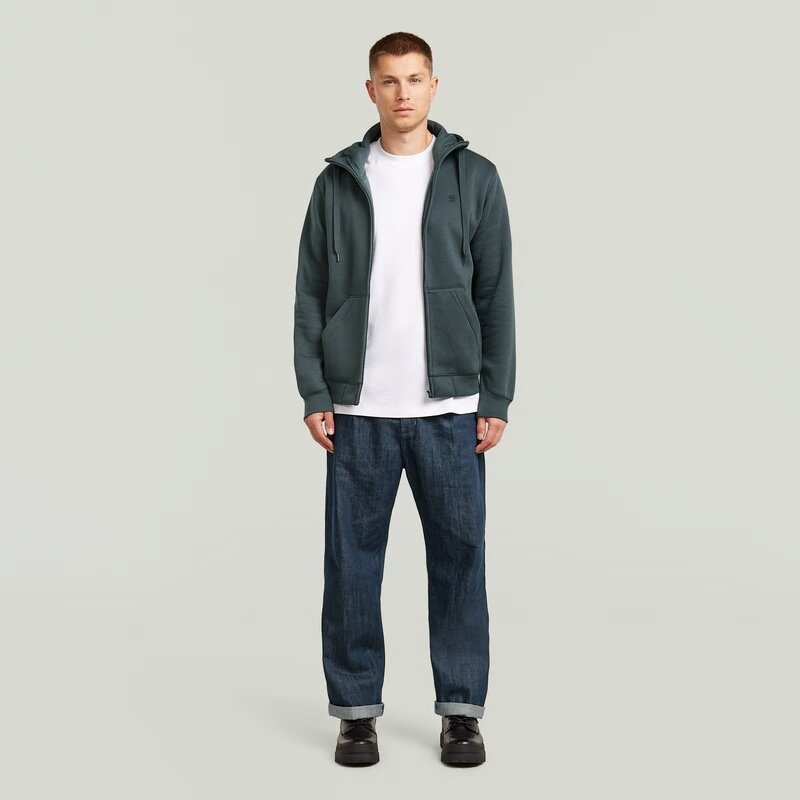 Hooded zip through sweater Premium Core features a split kangaroo pocket and a hood with a raised front and drawstrings. The sleeves have a curved finish, showing a ribbed cuff underneath. The G-STAR embroidery at the chest completes this hooded sweater jacket.