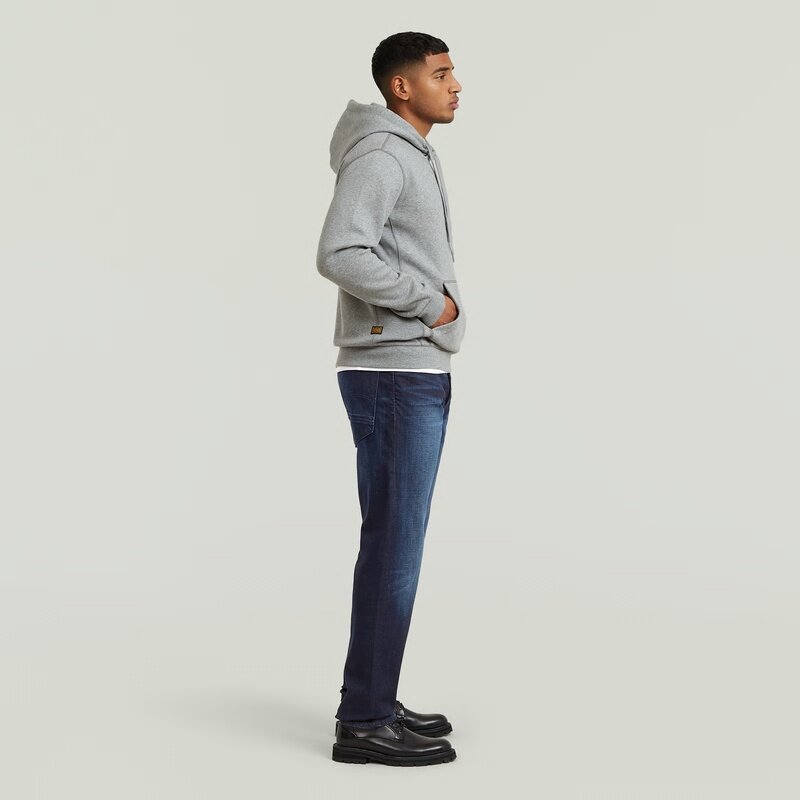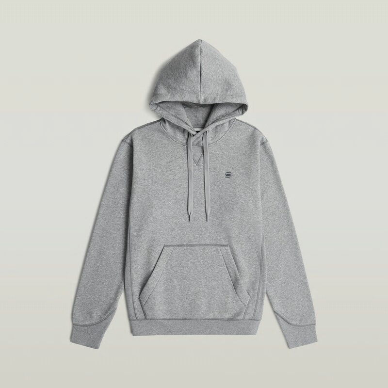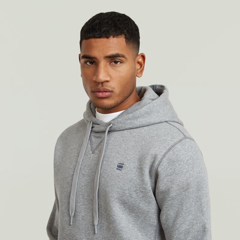 The Premium Core hoodie features a hood with a cross over construction and a ribbed inset piece.
