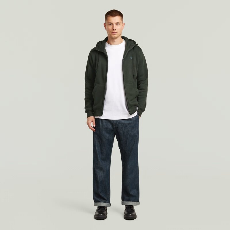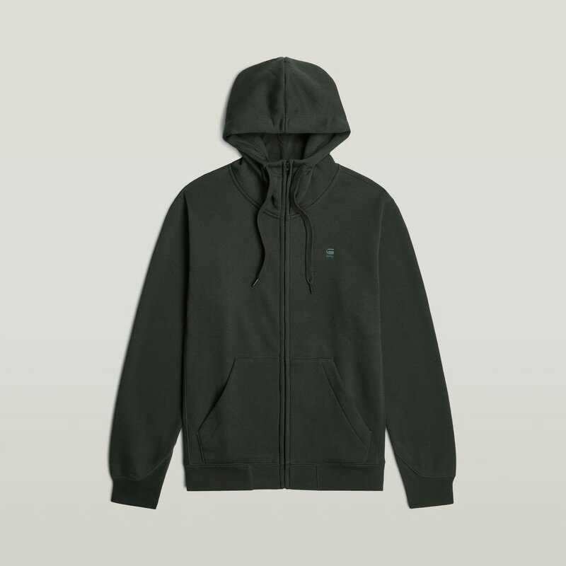 Hooded zip through sweater Premium Core features a split kangaroo pocket and a hood with a raised front and drawstrings. The sleeves have a curved finish, showing a ribbed cuff underneath. The G-STAR embroidery at the chest completes this hooded sweater jacket.