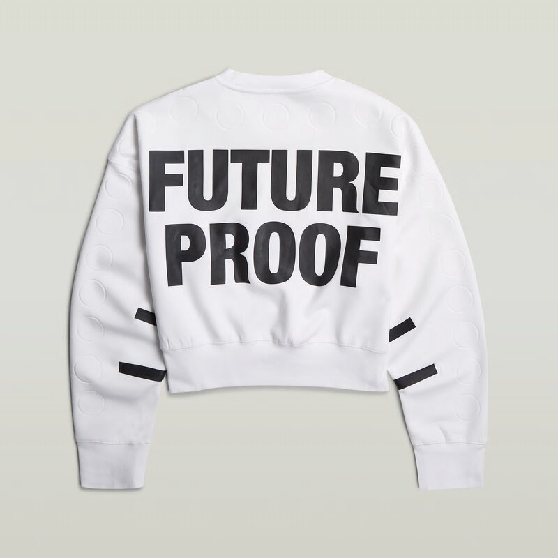 Designed by Walter Van Beirendonck, the Unisex Cropped Sweatshirt was created with minimal stitching, experimenting with glue and tape. The sweatshirt features an oversized fit, crewneck collar, and 3D-embossed balls on the front and sleeves. Van Beirendonck’s slogan "Future Proof" is printed on the back.