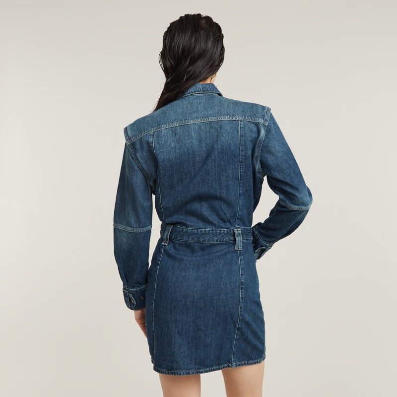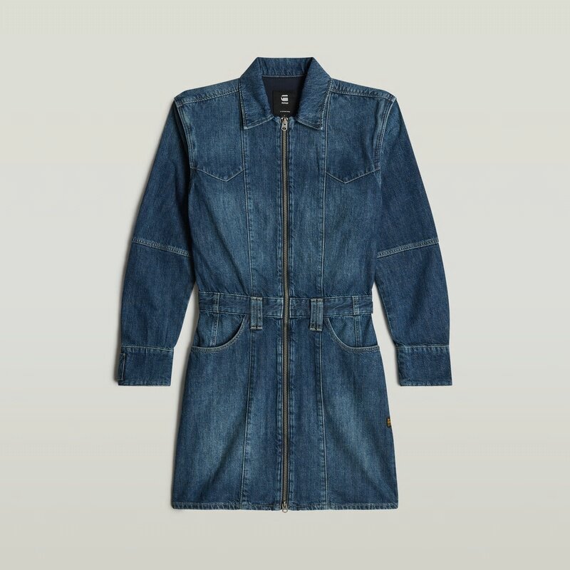 Denim dress Biker offers an upper leg length and is designed as a modular style. Unzip the sleeves to change this long sleeved dress into a sleeveless dress. When preferred a belt can be added to the beltloops applied.
