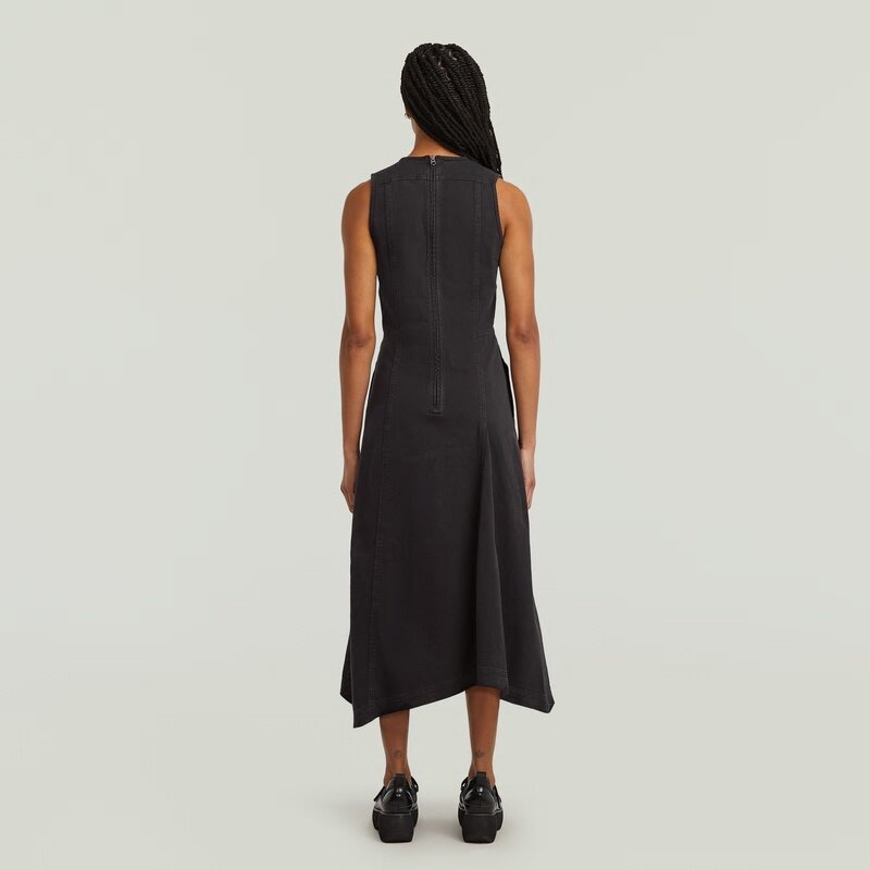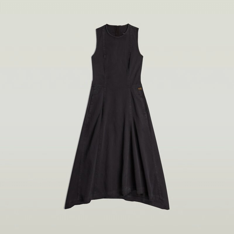 The Corset Flare Dress features a fit-and-flare design with a sleeveless construction and broad straps. Its long length and zip closure add a touch of elegance.