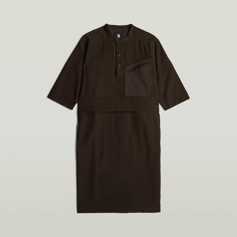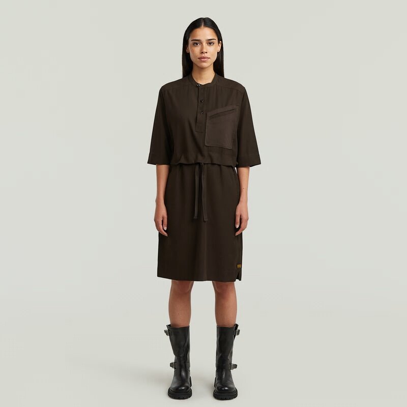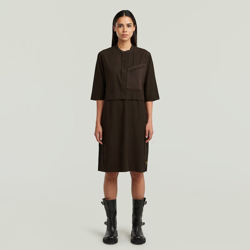 The Half Placket Shirt Dress features a button closure and a stand-up collar. Its knee-length design and half sleeves offer a versatile look.