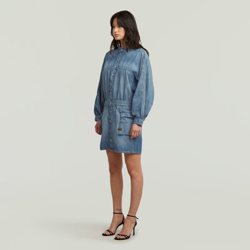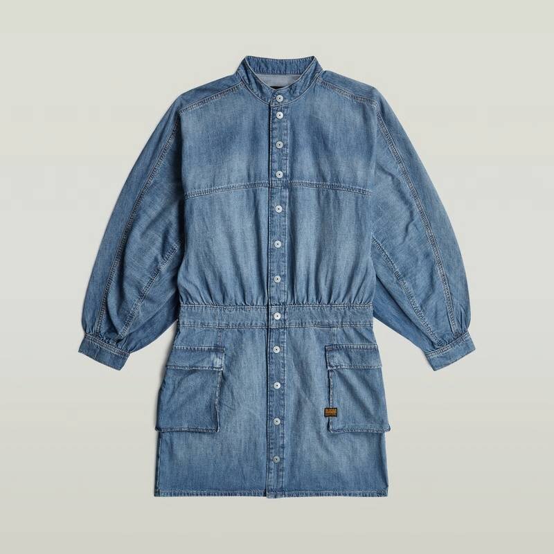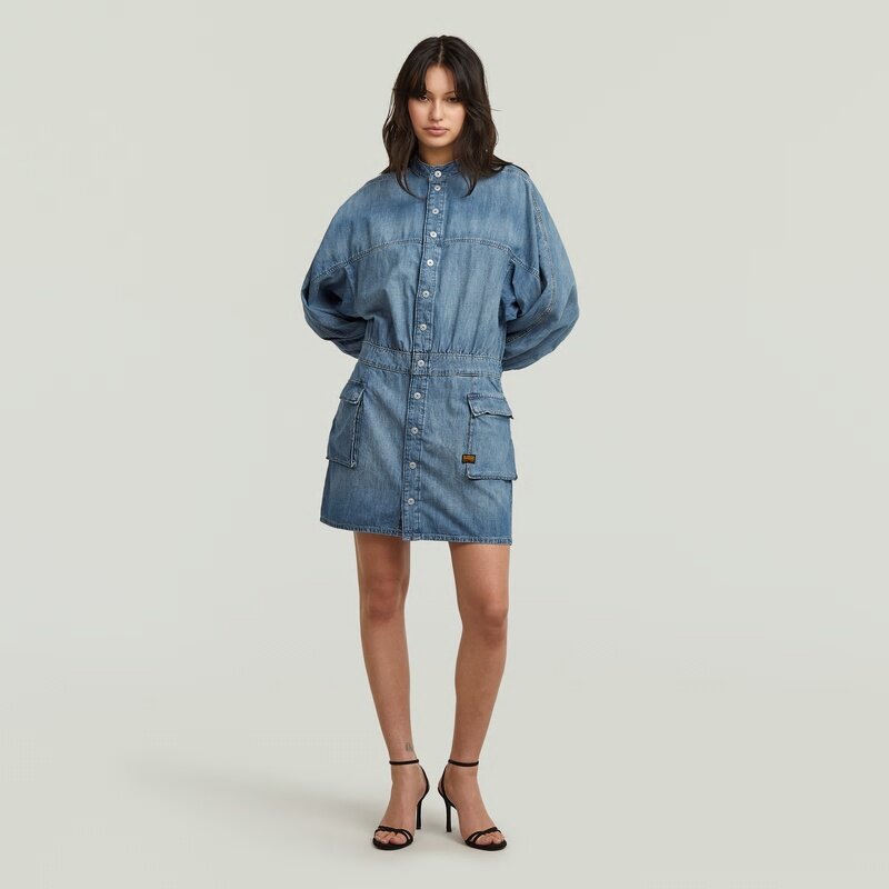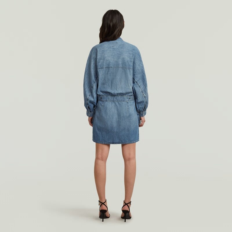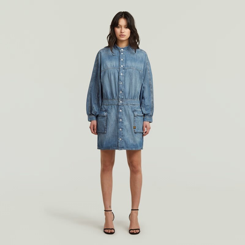 Dress Macro Balloon is designed in a short length and offers voluminous sleeves. The lowered shoulder panel adds to the loose fit. Use the tabs to add more shape to the waist. This denim dress combines a band collar with a snap button closure. Also the 3D-flap pockets close with snaps, but these are placed concealed.
