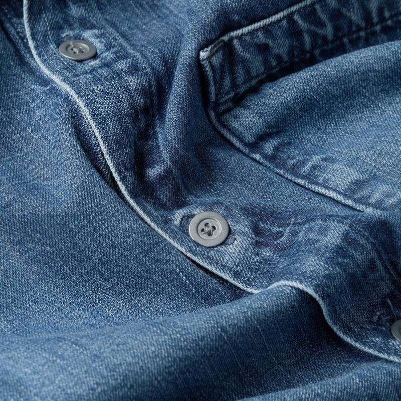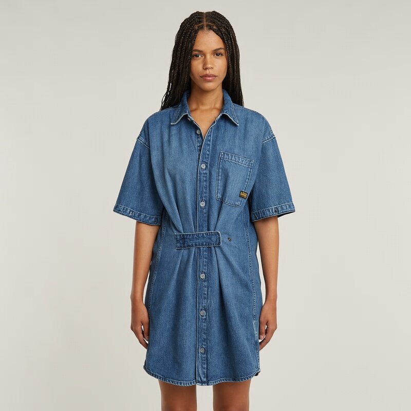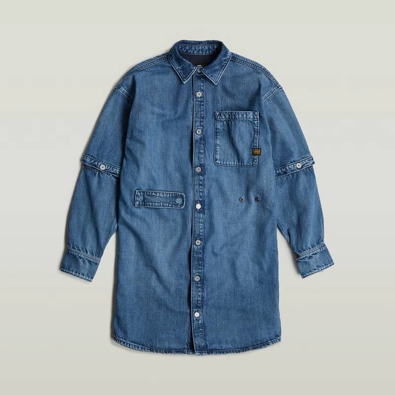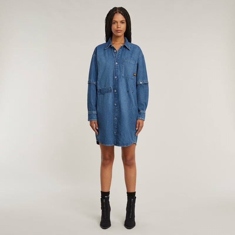 Shirt dress Modular is designed in a loose fit and offers multiple ways to style. For a tighter silhouette, simply close the tab across the waist. The sleeves can be transformed in a shorter length by detaching the lower section. Alternatively, open the buttons and wear it as a longer denim overshirt.