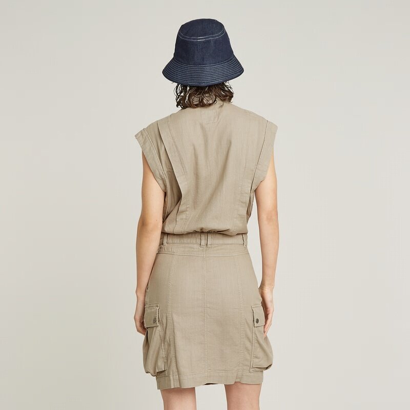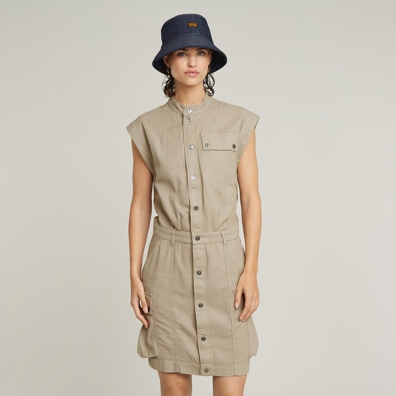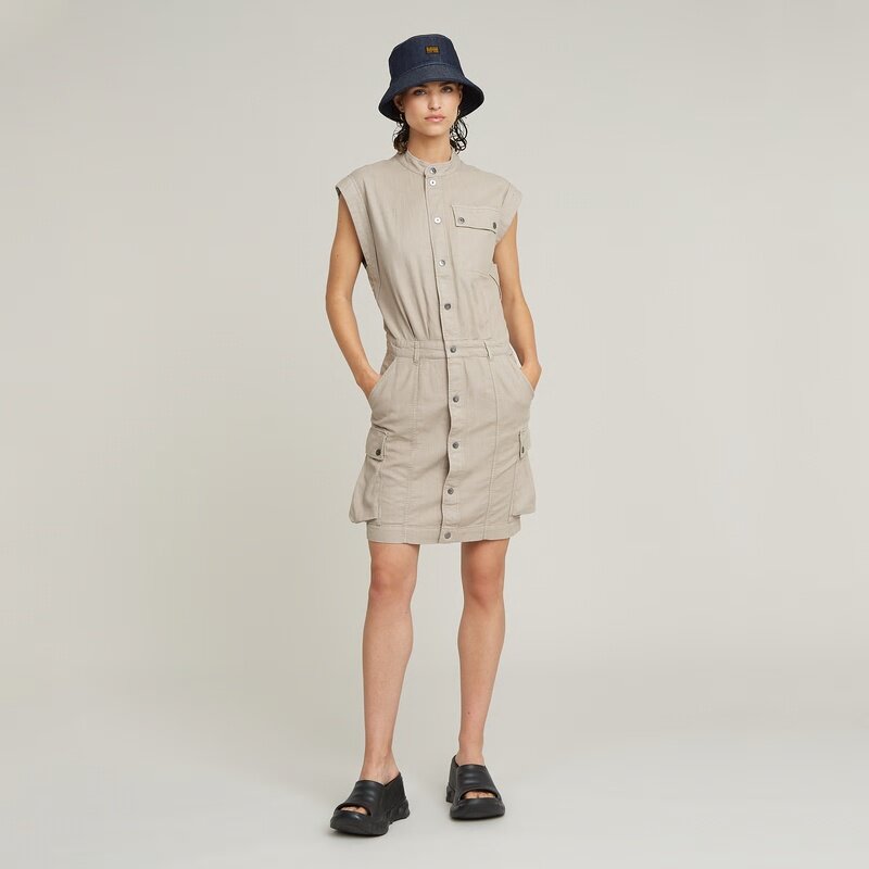 Dress pocket offers a straight fit that runs towards the knee. The shoulders are widened and finished with a broad binding. Flap pockets with snap buttons are created at the chest and thigh. Belt loops allow for a belted design.