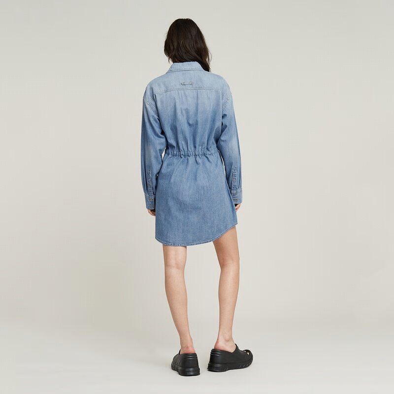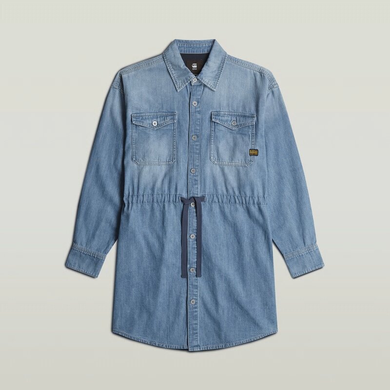 Denim dress Drawcord is cut in an upper leg length. Wear it relaxed as is or tighten the woven tape to create more volume. Flap pockets at the chest are combined with pockets at the side seams.