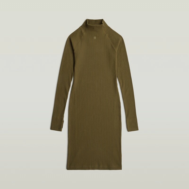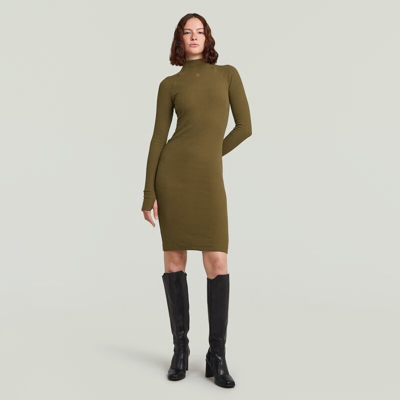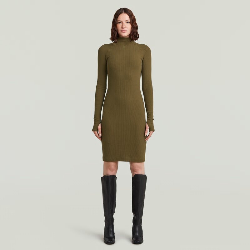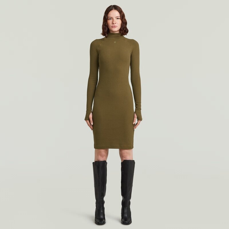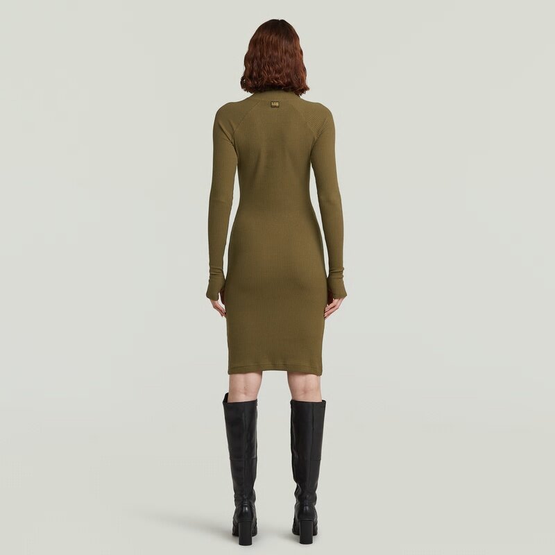 The Rib Slim Dress offers a sleek silhouette with a stand-up collar and knee-length design.