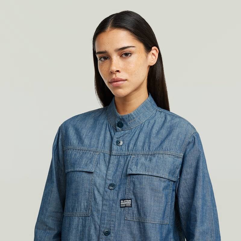 Shirt Dress is designed in a loose fit in an upper leg length. A band collar is finished with a full front snap button closure. This dress has deep waist pockets. The entry of the chest pockets is concealed and offers a hidden snap button closure. The sleeves are cut slightly shorter, offering a 3/4 length with slits and a snap button closure.