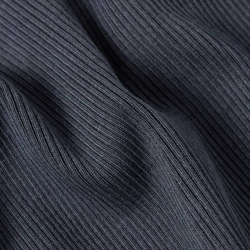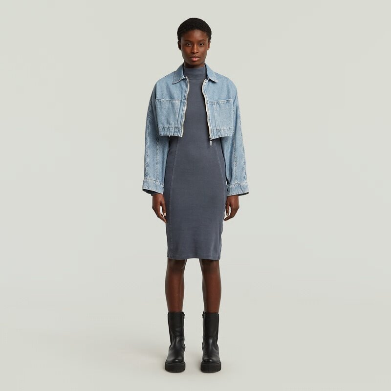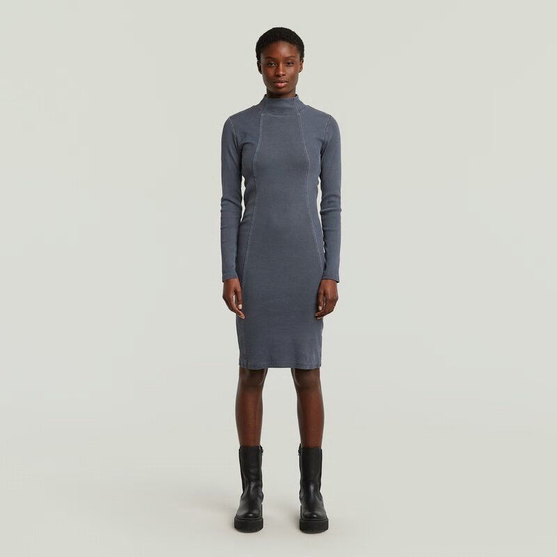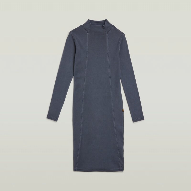 The Washed Slim Rib Dress features a slim fit with a funnel collar and long sleeves.