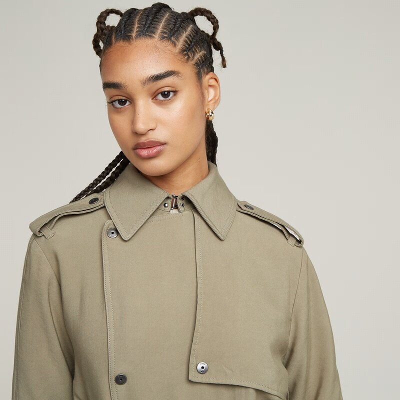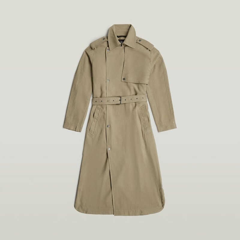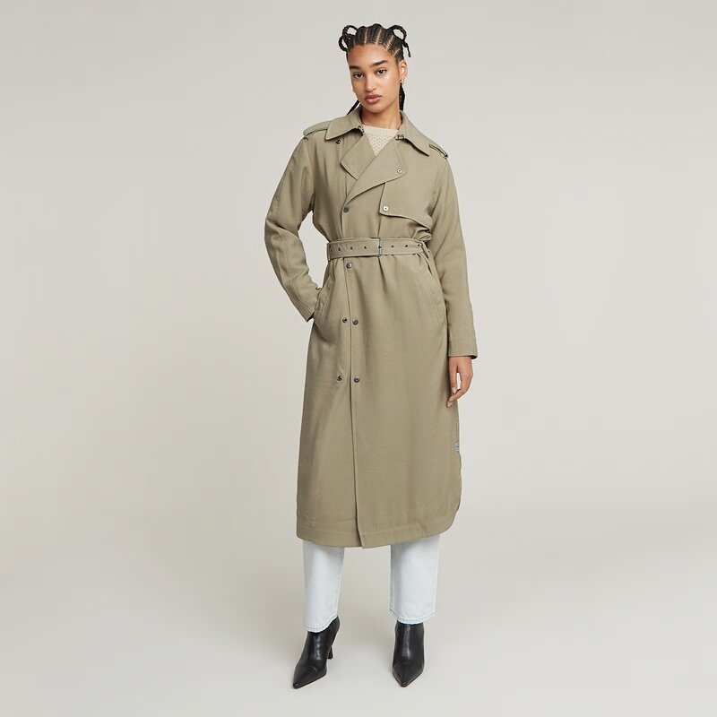 Trench coat Fluid shows authentic details like the epaulettes at the shoulders, the chest flap and the deep back slit. A modern twist is created by the curved hem and side slits.