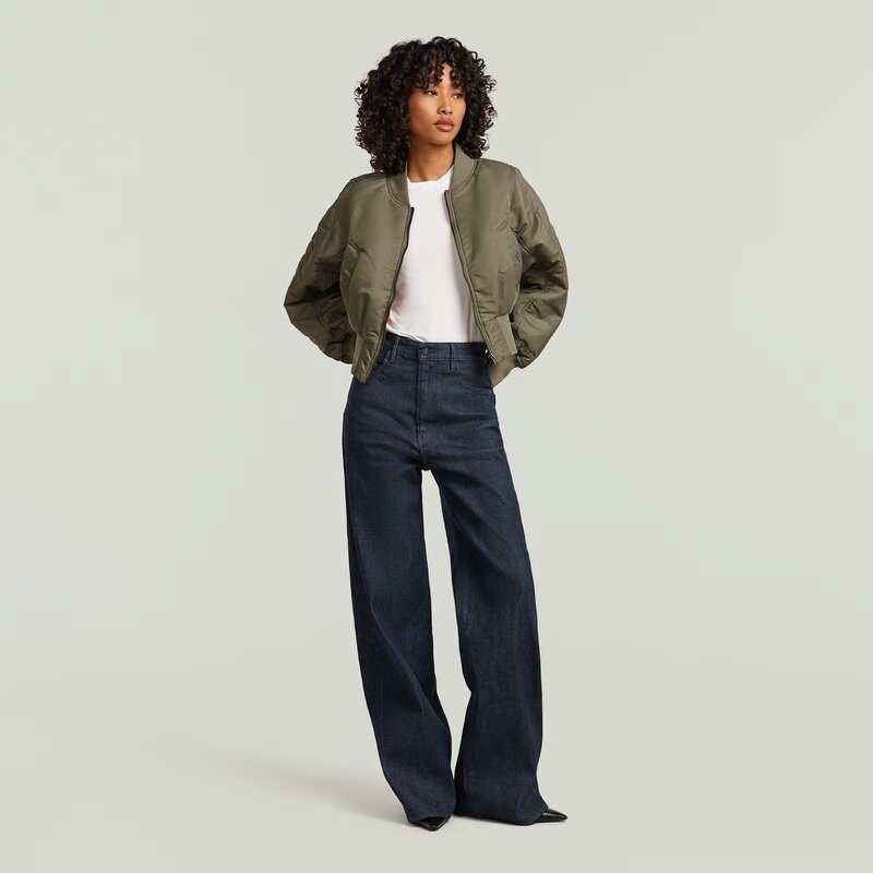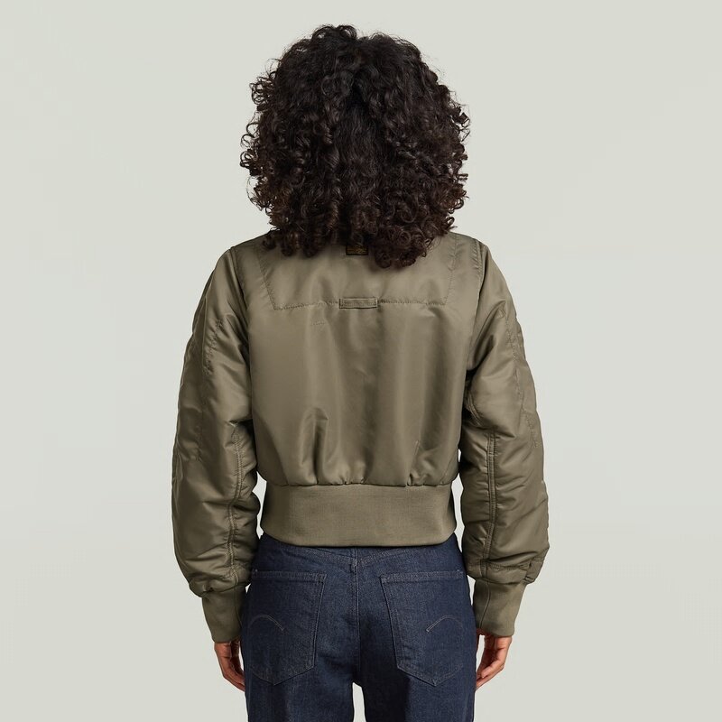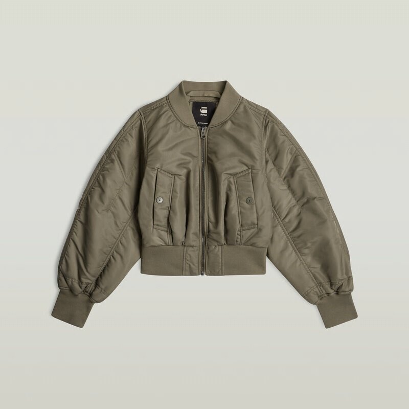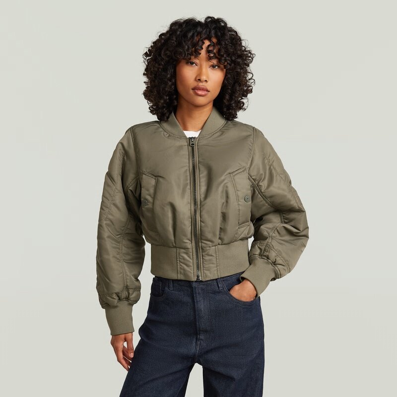 This bomber jacket features a loose fit and a short length, offering a modern twist on a classic design. The ribbed collar and zip closure enhance its timeless appeal.