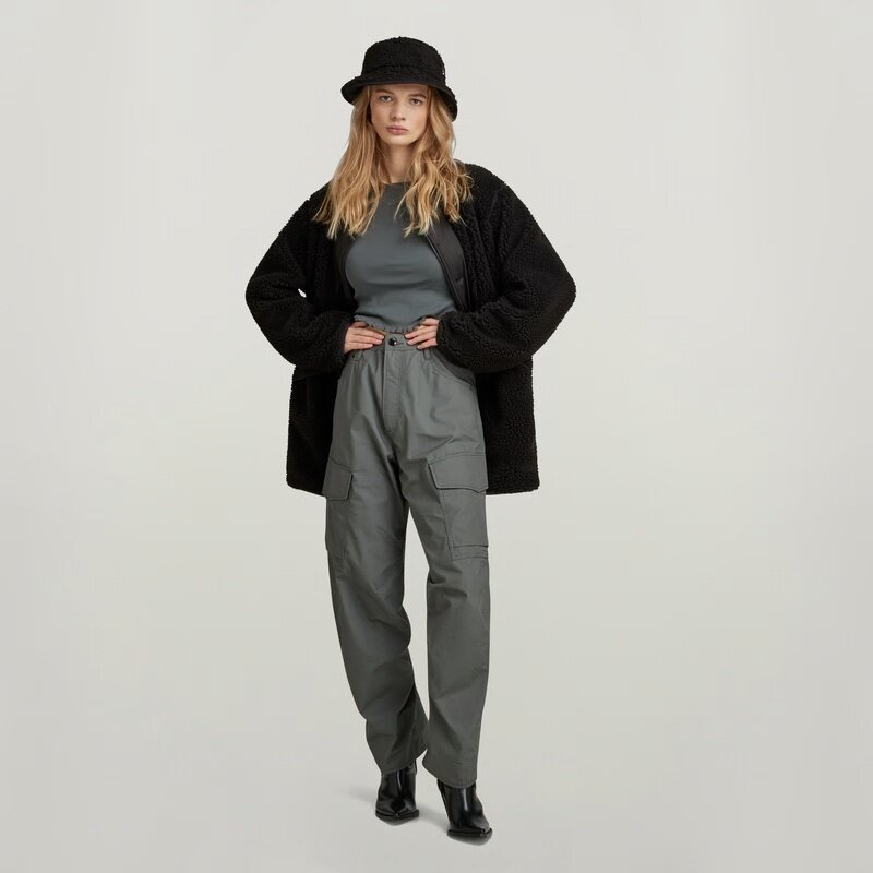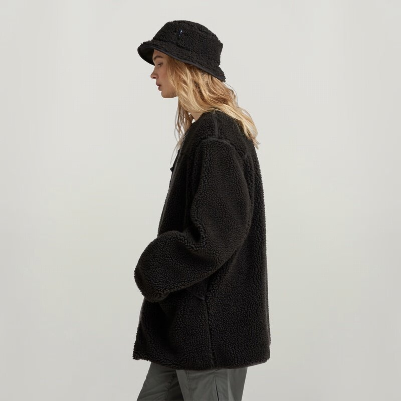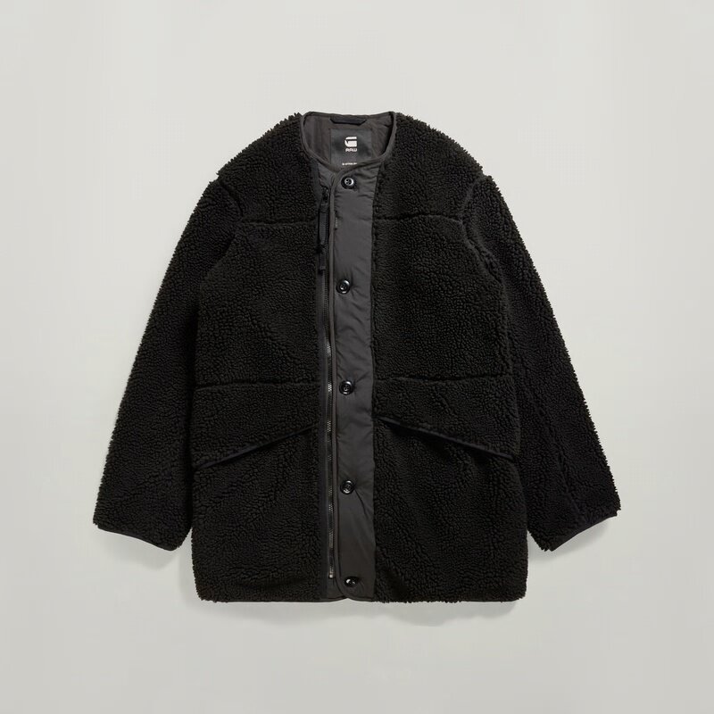Jacket Long Teddy offers a comfortable extra layer. This comfy piece can be combined with an oversized lighter weight style for extra warmth or used as an in between jacket as is. Pockets are added to the waist. The button closure is combined with a zipper along the side. A slim binding at the edges completes it.