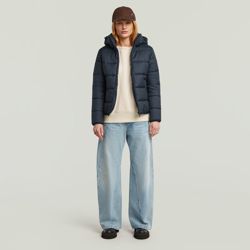 The Meefic Jacket offers a padded and quilted design with a hood and zip closure.