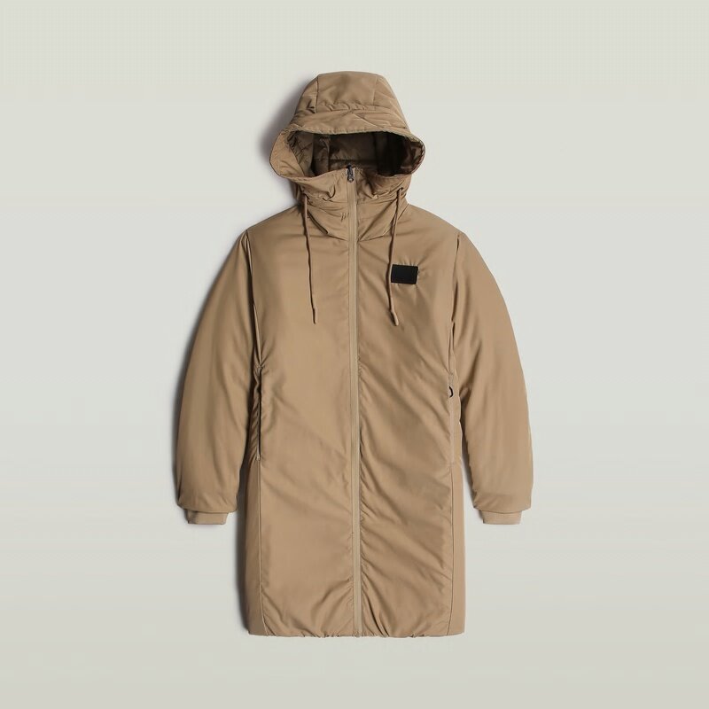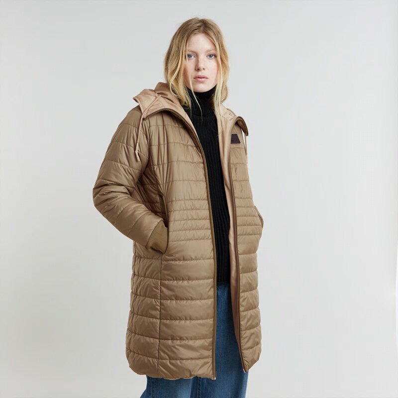 The reversible parka creates two different looks in a midi length. Offering wind protection through the coated zipper and comfortable peak hood. One side offers a clean look with zipper pockets at the waist. The other side shows a stitched through design with bounded waist pockets.