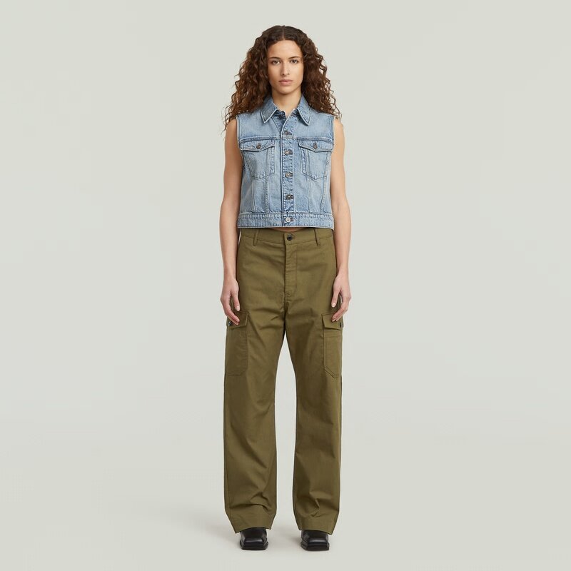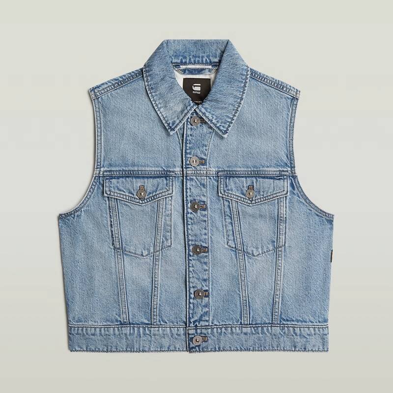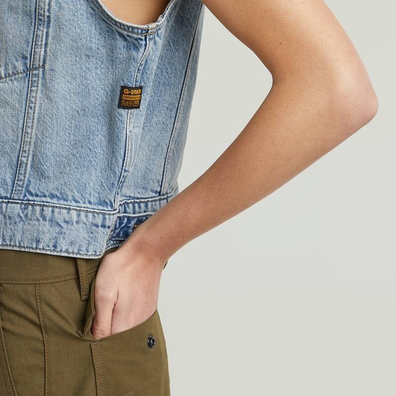 Sleeveless denim jacket Shrunken is cut in a straight fit and offers a Western design. Flap pockets at the chest are finished with a shank button closure alike the front. The tabs at the back allow for a tighter waist.