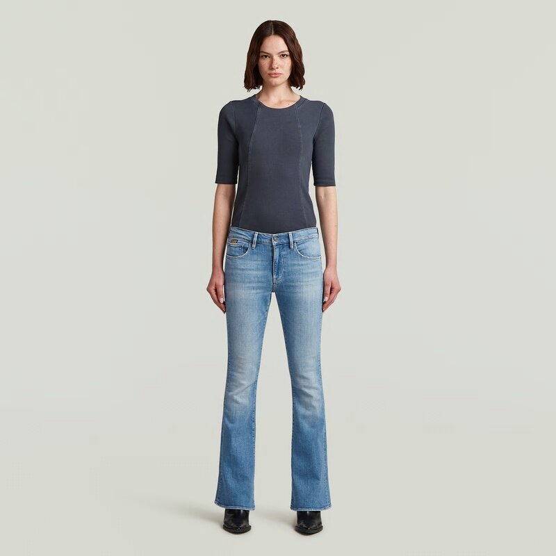 Inspired by the '70s, reimagined for today. Sitting mid waist, the 3301 Flare is a timeless staple. It is fitted at the thigh and flared from the knee towards the hem.