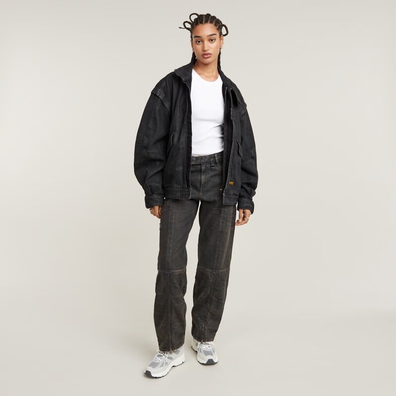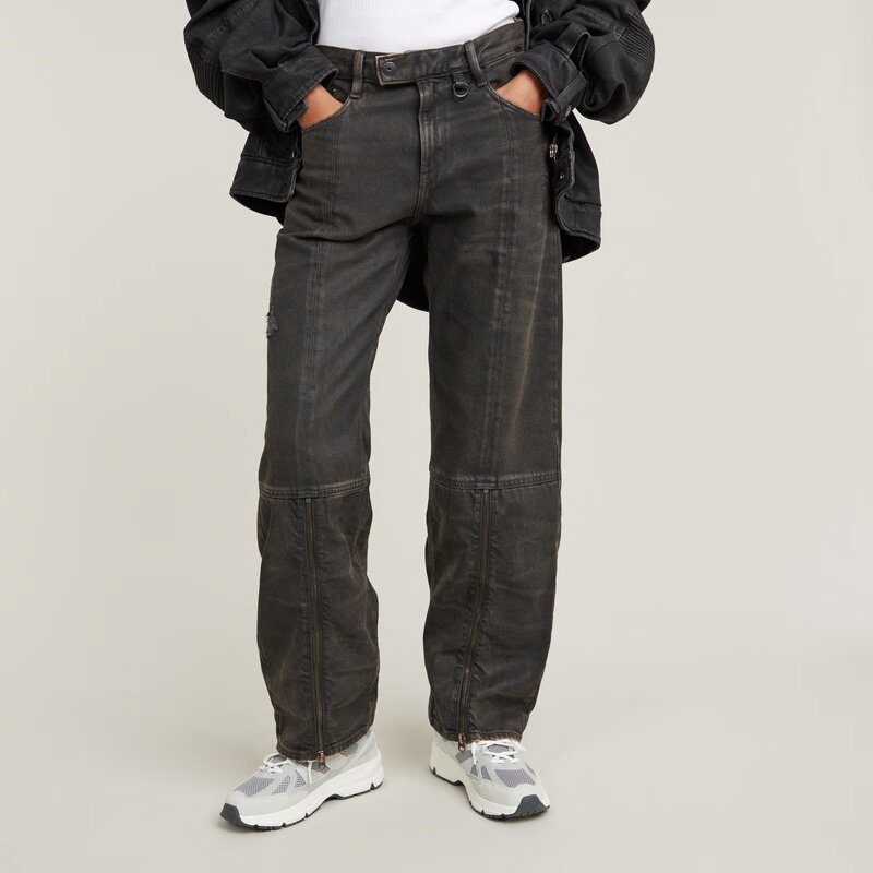 Jean Judee Biker is designed in a loose fit and offers a low waist. The coin pocket is repositioned towards the inside waist, leaving only the rivets to show. Open the zippers at the hem to create a slit. The small slit at the back can be reduced by the shank buttons applied. The key ring at the waist adds detail.