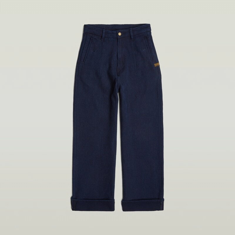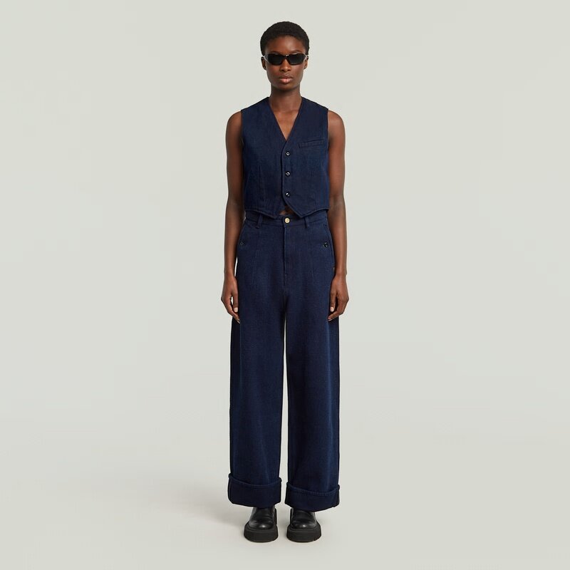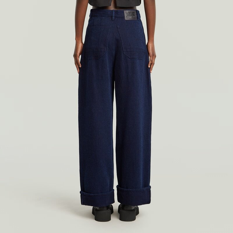 Jean Roos is cut in a loose fit and offers a high waist. It is designed to show a lowered crotch. The chunky turn up adds character. Unfold for an extra length with a voluminous, wrinkled effect around the ankles. These jeans show slim welt front pockets with a shank button closure. The squared pockets at the back are cut in shape with slanted corners.