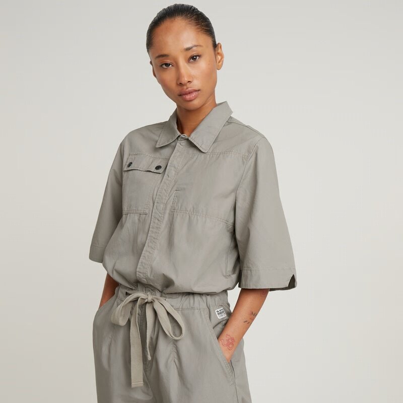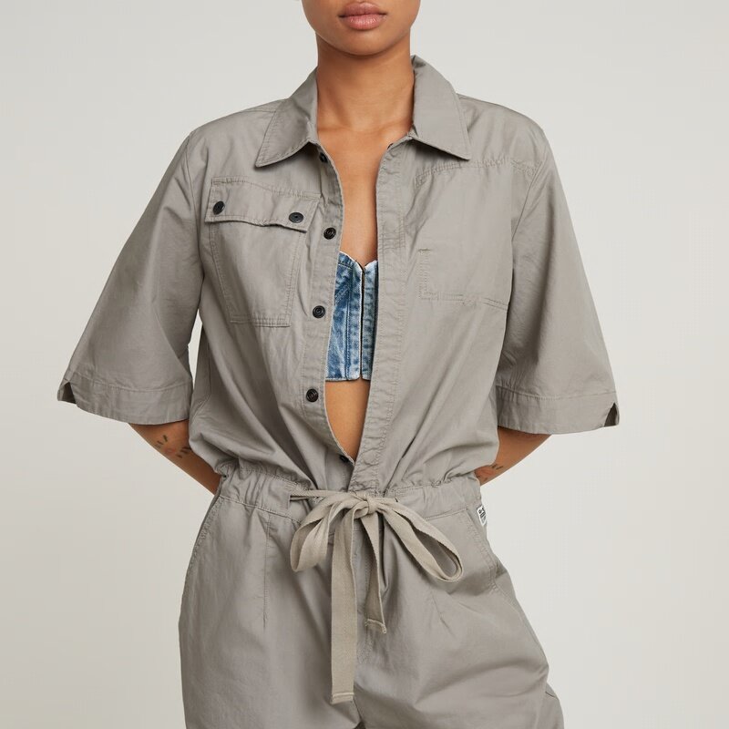 Jumpsuit Army offers a straight fit with hidden snap buttons. The stretchable waist and woven belt emphasize the waist. The sleeves are kept slightly longer. At the chest a flap pocket is combined with a hidden chest pocket on the inside. Waist pockets and a shoulder panel with pleats underneath complete it.