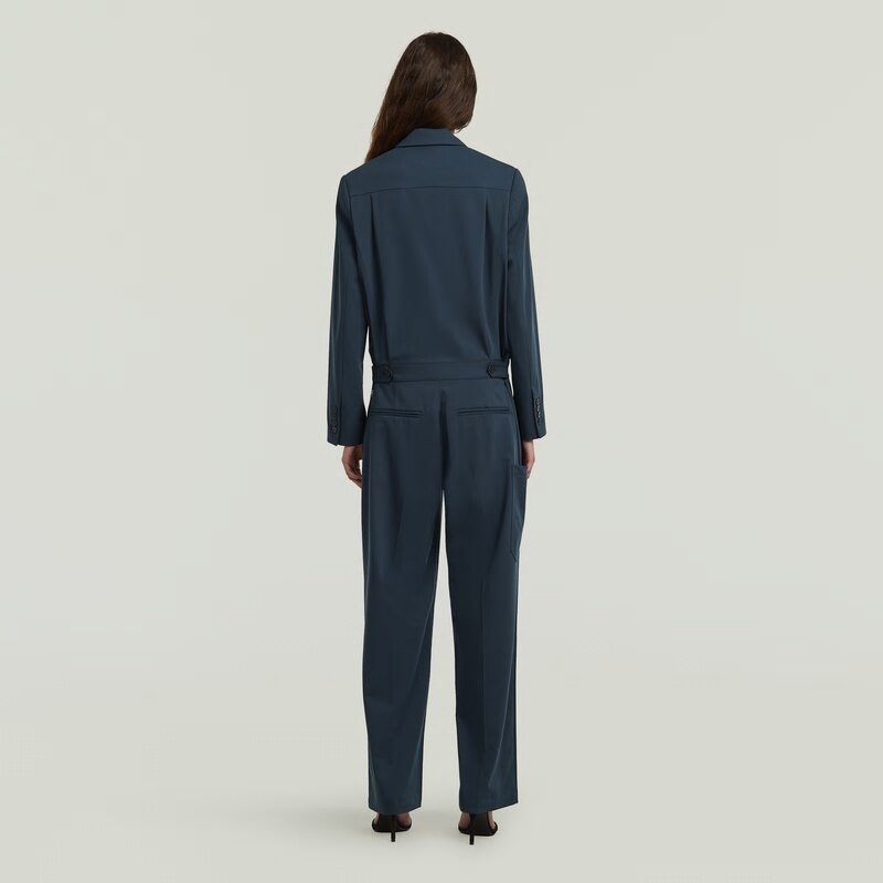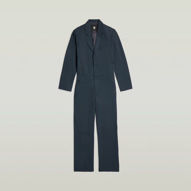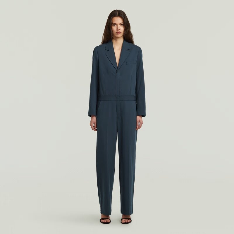 This blazer jumpsuit combines a tailored design with a modern aesthetic. Featuring a lapel collar and a V-neckline, it is equipped with a snap button and zip closure for a refined finish.
