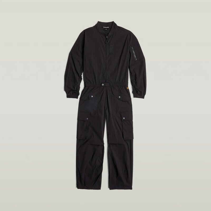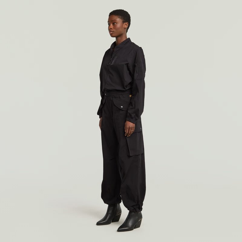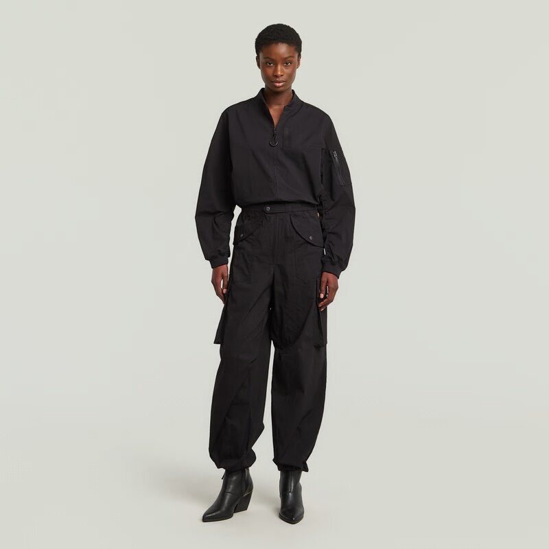 The Bomber Jumpsuit combines a sleek design with a high waist and long sleeves, offering a comfortable fit with a zip closure.