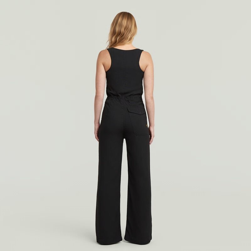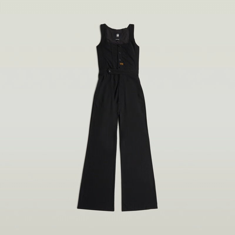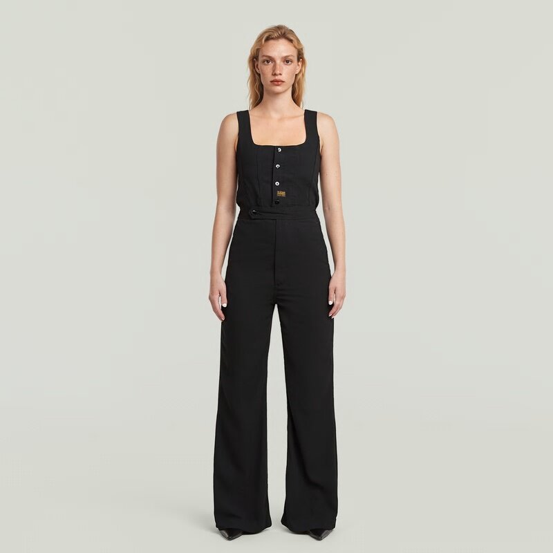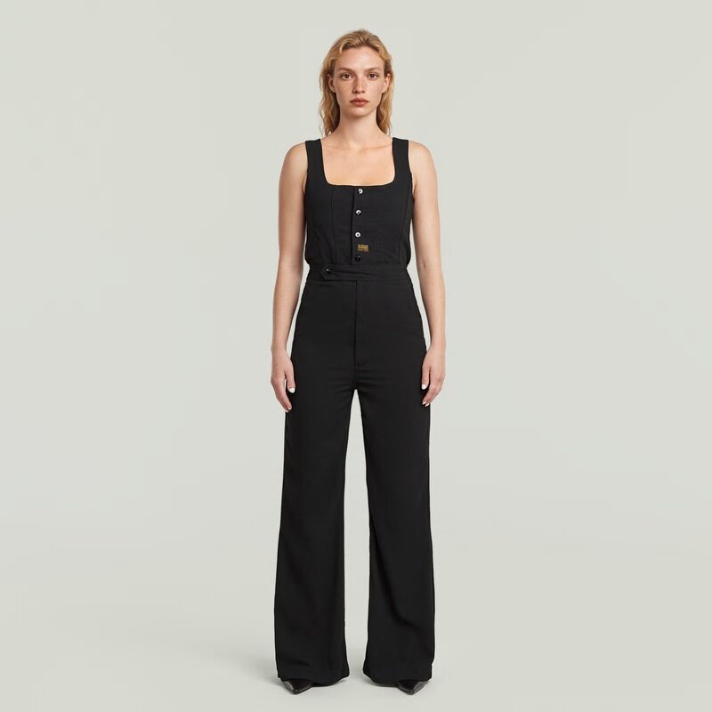 The High Waist Jumpsuit features a slim fit with an ultra-high waist and broad straps, offering a sleek and sophisticated look.
