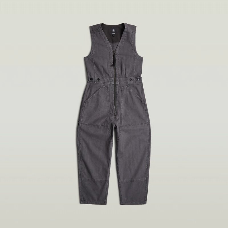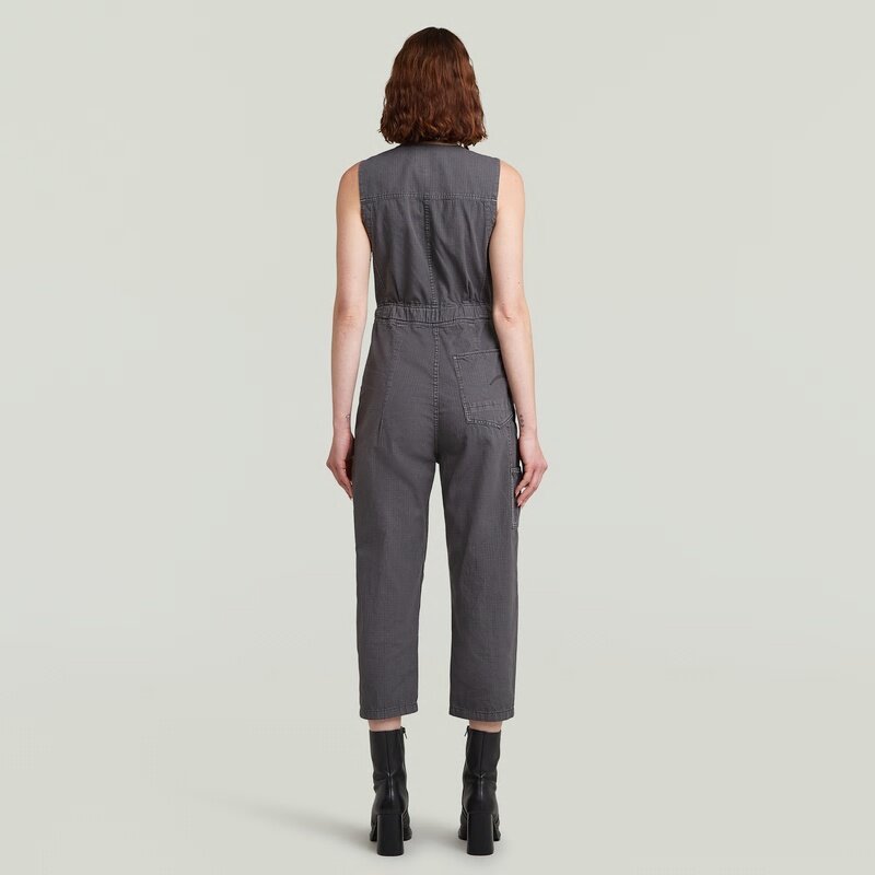 This relaxed jumpsuit features a sleeveless design with a high waist, offering a comfortable fit.